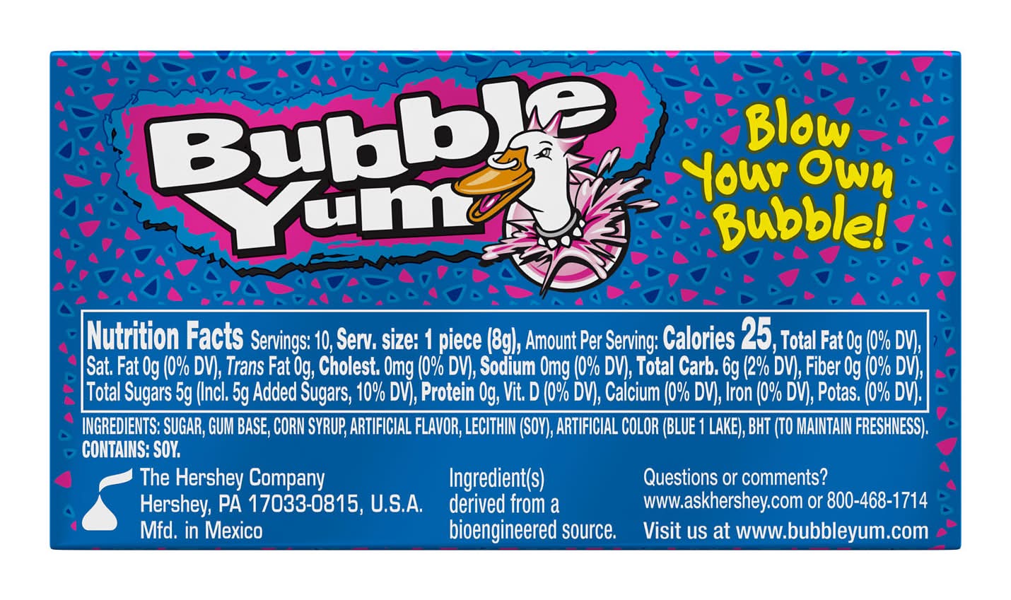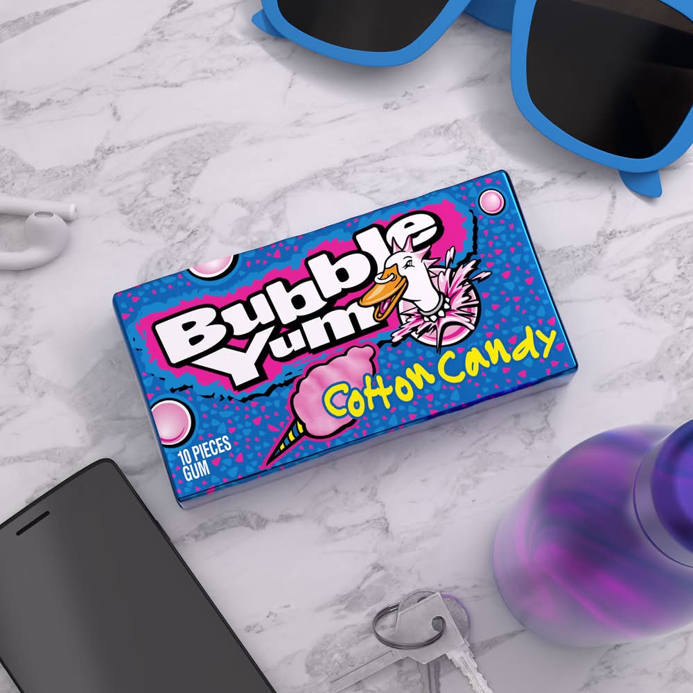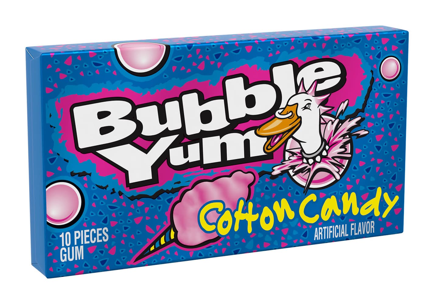 BUBBLE YUM cotton candy flavored bubble gum has a soft texture and fun cotton candy flavor you will love to chew on and share with friends. This pack contains 10 individually wrapped pieces of gum that you can hand out at birthday parties, sporting events and any time that deserves a chewy and flavorful treat. Try blowing the biggest bubble to keep the kiddos entertained or keep packs stored in your work desk drawer for a sweet and chewy midday treat. This pack of BUBBLE YUM cotton candy flavored bubble gum can travel with you anywhere, whether you're on a road trip, driving to the grocery store or out with your best friends. Stack individual packs of gum in your candy drawer or gift them to your favorite people during the holidays. Create sweet Valentine's Day gift bags, Easter candy baskets and plastic Easter eggs, festive Christmas stockings and Halloween candy displays for a night full of chewy and delicious fun. Or, celebrate ordinary moments throughout the year with the sweet and chewy flavor of classic bubble gum. Just don't forget to save a few pieces of BUBBLE YUM cotton candy flavored bubble gum for yourself during all of that sharing! • Flavor: Cotton candy • Size: 1 CT