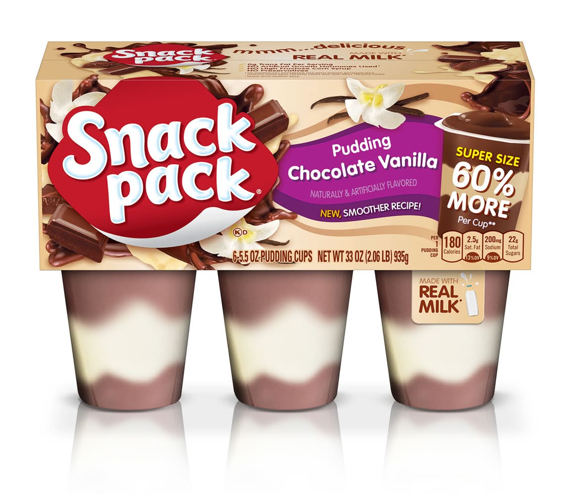 Delight in a quick and tasty treat any time of day with Snack Pack Super Size Chocolate Vanilla Pudding Cups. These pudding snacks offer a classic chocolate and vanilla flavor with creaminess that everyone is sure to love. These vanilla chocolate pudding cups are made with real nonfat milk and no preservatives or high fructose corn syrup. Each super-size pudding cup has 60% more pudding per cup than regular-sized Snack Pack pudding cups and does not need to be refrigerated, making this a reliable treat that is easy to pack up and take with you to work for office snacks, in your kids’ lunch boxes for school snacks or anywhere for easy snacks and sweet treats. These Snack Pack pudding cups also make easy after-dinner sweet treats or desserts for the entire family. If you want to add some extra excitement to these pudding cups, try topping them with whipped cream and sprinkles, fruit or cookie crumbles for a creative and easy dessert. Enjoy the fun with Snack Pack! • Flavor: Chocolate - vanilla • Size: 5.5 OZ • Conagra Brands, P.O. Box 3534,Chicago,IL,60654