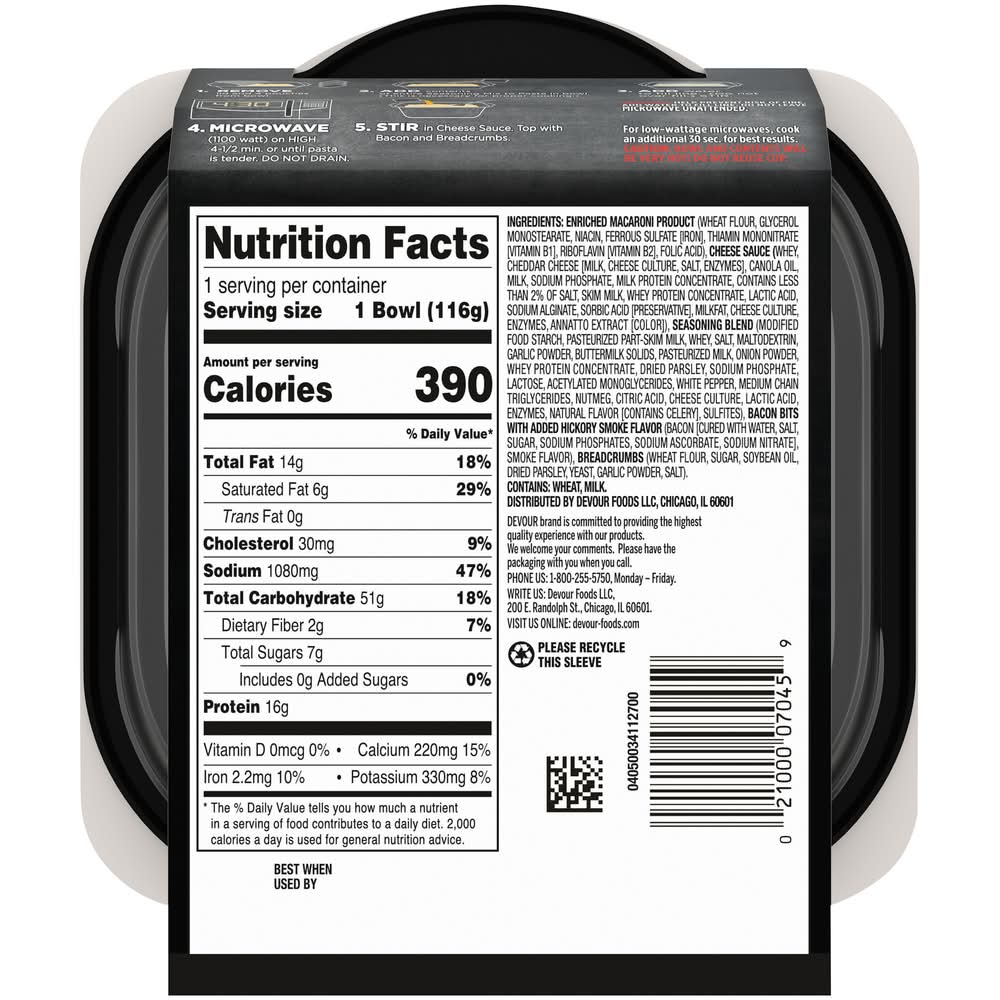 DEVOUR Creamy Alfredo Mac & Cheese with Bacon dials up the taste, maxes out the flavor and turns up the texture with this easy to make single serve meal. This 4.1 ounce hearty mac and cheese bowl is sure to satisfy big appetites. We took perfectly cooked pasta and drenched it in rich, creamy Alfredo cheese sauce, and then we topped it off with perfectly seasoned breadcrumbs and hearty bacon pieces crisped to perfection. Ready to eat in minutes, this delectable cheesy Alfredo noodles dish is simple to prepare in the microwave so you can start feasting in just a few minutes. DEVOUR pre-cooked foods make it easy to enjoy hot, mouthwatering food at home or in the break room, so be sure to keep your fridge stocked with deliciousness. Show your taste buds a good time and enjoy a tasty Alfredo mac and cheese with bacon feast. • Size: 4 OZ • Devour Foods LLC, 200 E. Randolph St.,Chicago, II, 60601, • Packaging: Reusable