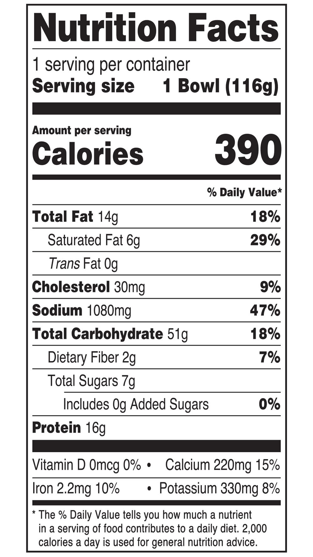 Ingredients: ENRICHED MACARONI PRODUCT (WHEAT FLOUR, GLYCEROL MONOSTEARATE, NIACIN, FERROUS SULFATE [IRON], THAMIN MONONITRATE [VITAMIN B1], RIBOFLAVIN [VITAMIN B2], FOLIC ACID), CHEESE SAUCE (WHEY, CHEDDAR CHEESE [MILK, CHEESE CULTURE, SALT, ENZYMES], CANOLA OIL, MILK, SODIUM PHOSPHATE, MILK PROTEIN CONCENTRATE, CONTAINS LESS THAN 2% OF SALT, SKIM MILK, WHEY PROTEIN CONCENTRATE, LACTIC ACID, SODIUM ALGINATE, SORBIC ACID [PRESERVATIVE], MILKFAT, CHEESE CULTURE, ENZYMES, ANNATTO EXTRACT [COLOR]), SEASONING BLEND (MODIFIED FOOD STARCH, PASTEURIZED PART-SKIM MILK, WHEY, SALT, MALTODEXTRIN, GARLIC POWDER, BUTTERMILK SOLIDS, PASTEURIZED MILK, ONION POWDER, WHEY PROTEIN CONCENTRATE, DRIED PARSLEY, SODIUM PHOSPHATE, LACTOSE, ACETYLATED MONOGLYCERIDES, WHITE PEPPER, MEDIUM CHAIN TRIGLYCERIDES, NUTMEG, CITRIC ACID, CHEESE CULTURE, LACTIC ACID, ENZYMES, NATURAL FLAVOR [CONTAINS CELERY], SULFITES), COOKED BACON BITS (BACON [CURED WITH WATER, SALT, SUGAR, SODIUM PHOSPHATES, SODIUM ASCORBATE, SODIUM NITRITE]), SEASONED BREADCRUMBS (WHEAT FLOUR, SUGAR, SOYBEAN OIL, DEHYDRATED PARSLEY, YEAST, GARLIC POWDER, SALT), . Contains: CONTAINS: WHEAT, MILK.