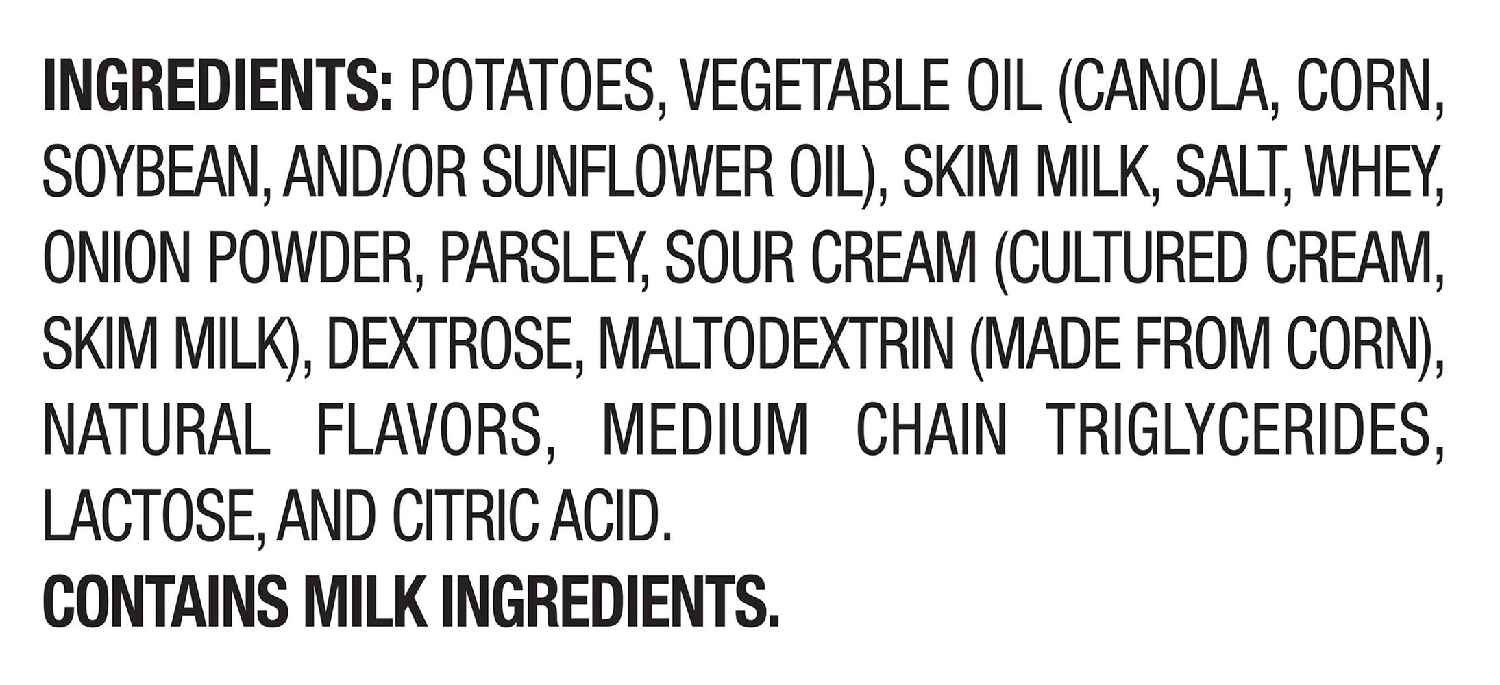 Ingredients: Potatoes, Vegetable Oil (Canola, Corn, Soybean, and/or Sunflower Oil), Skim Milk, Salt, Whey, Onion Powder, Parsley, Sour Cream (Cultured Cream, Skim Milk), Dextrose, Maltodextrin (Made from Corn), Natural Flavors, Medium Chain Triglycerides, Lactose, and Citric Acid Contains: Milk, Corn, Soybeans, Lactose