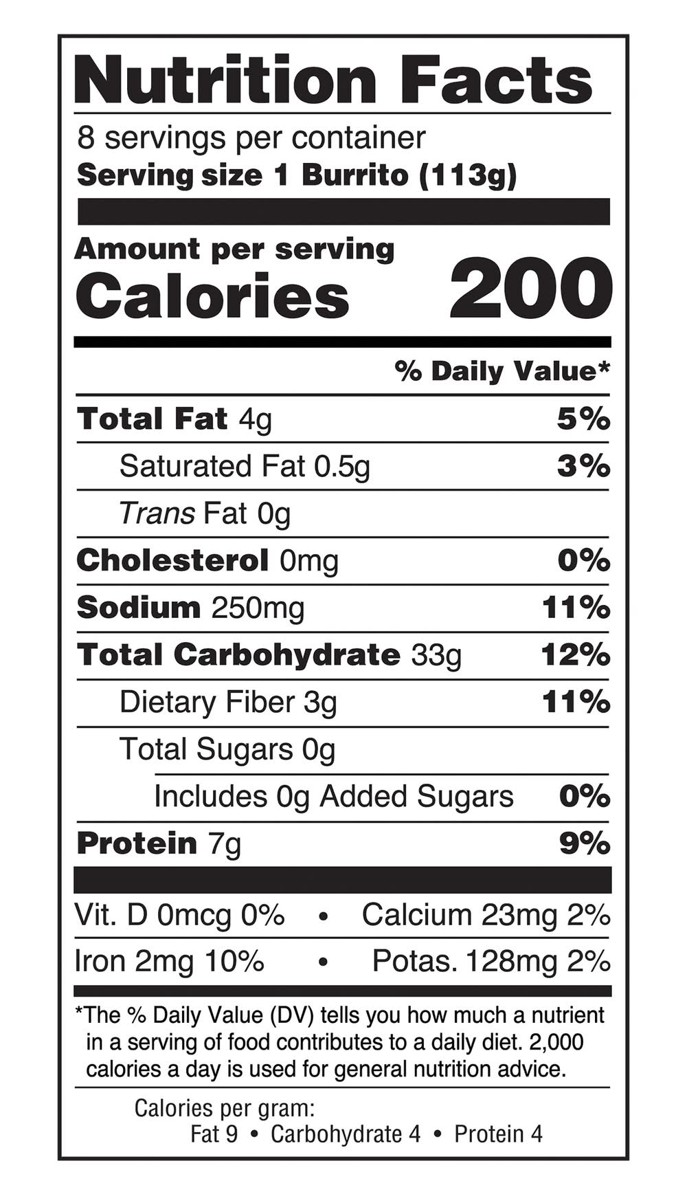 Directions for use: Cooking Instructions: Microwave: (1,100 watt microwave). Setting: High. Place 1 burrito on microwave safe plate. Frozen: 1 Minute 15 seconds. Let product stand for 1 minute before eating. Oven: Preheat oven to 350 degrees F. Place burritos on baking sheet with 1 inch between burritos. Bake uncovered. Frozen: 28 minutes. Let product stand for 1 minute before eating. For food safety and quality, internal product temperature must reach. 165 degrees F. Since ovens and microwaves vary, cooking times may require adjusting. Caution: Product may be hot. Keep frozen. Storage recommendation: Keep frozen.