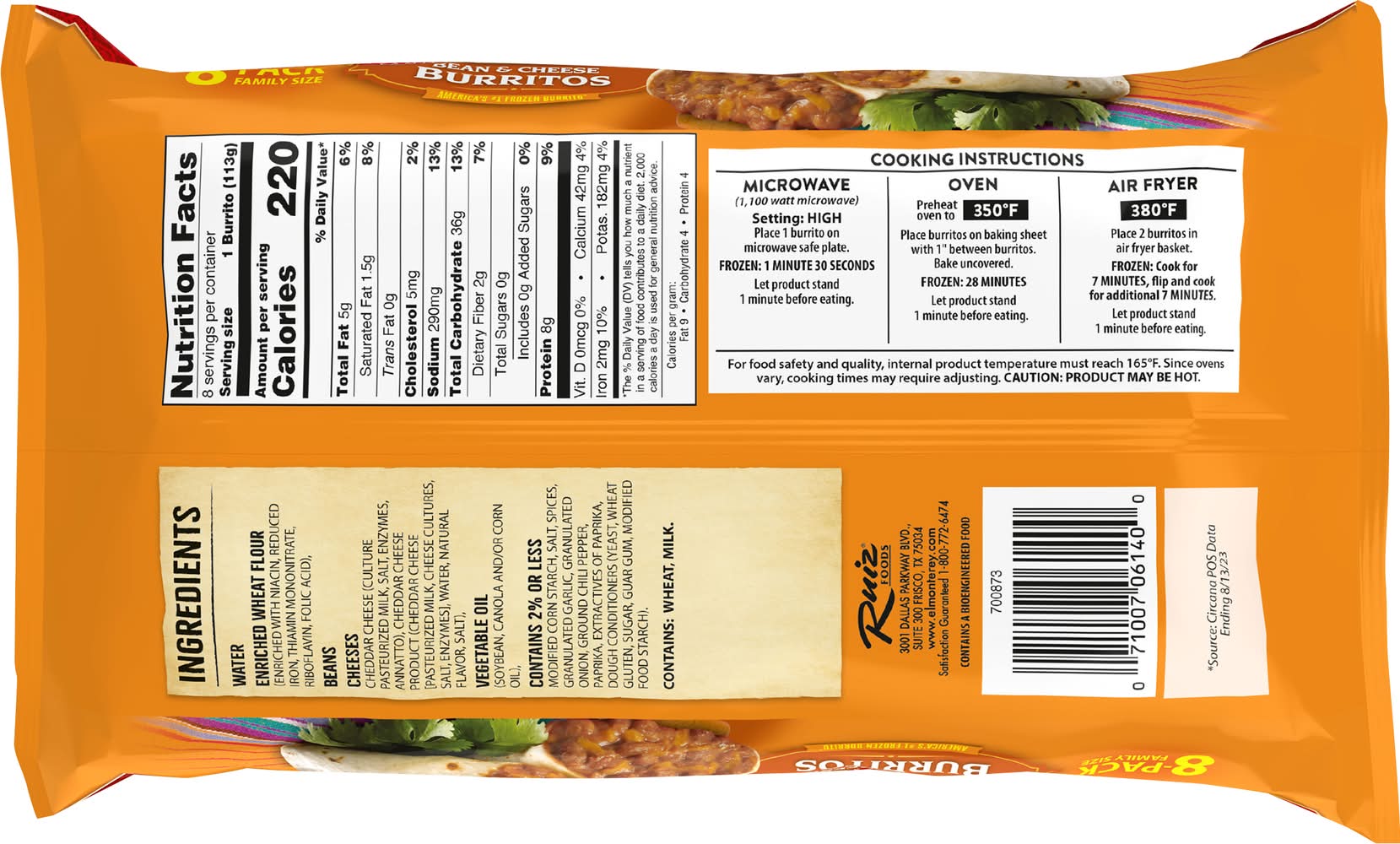 Frozen Mexican food that's a crowd favorite! Serve up El Monterey Bean & Cheese Burritos and your family will walk away satisfied and full. Frozen meal or frozen dinner ready in just minutes, this delicious burrito includes flavorful beans, real cheese and authentic Mexican spices wrapped in an fresh-baked flour tortilla. Stock up on these burritos today! Whether you need a filling bite for lunch, easy dinner, or quick snack food, you can trust El Monterey frozen burritos to satisfy your craving for authentic Mexican flavors and spices and quiet your grumbling stomach. Committed to quality and tradition, these El Monterey microwavable burritos deliver 7 grams of protein to keep you satisfied and help you power through the day. Enjoy authentic El Monterey Bean & Cheese Burritos at home or on-the-go in minutes! Bite into crispy oven-baked goodness in less than 30 minutes or zap your burrito in the microwave for authentic flavor in seconds. Stock up on El Monterey's wide variety of taquitos, single serve meals and frozen burritos for breakfast, lunch and dinner! You can find El Monterey Bean & Cheese Burritos in the frozen Mexican or frozen meal section with the orange package! • Size: 32 OZ • Ruiz Foods, PO Box 37Dinuba, CA