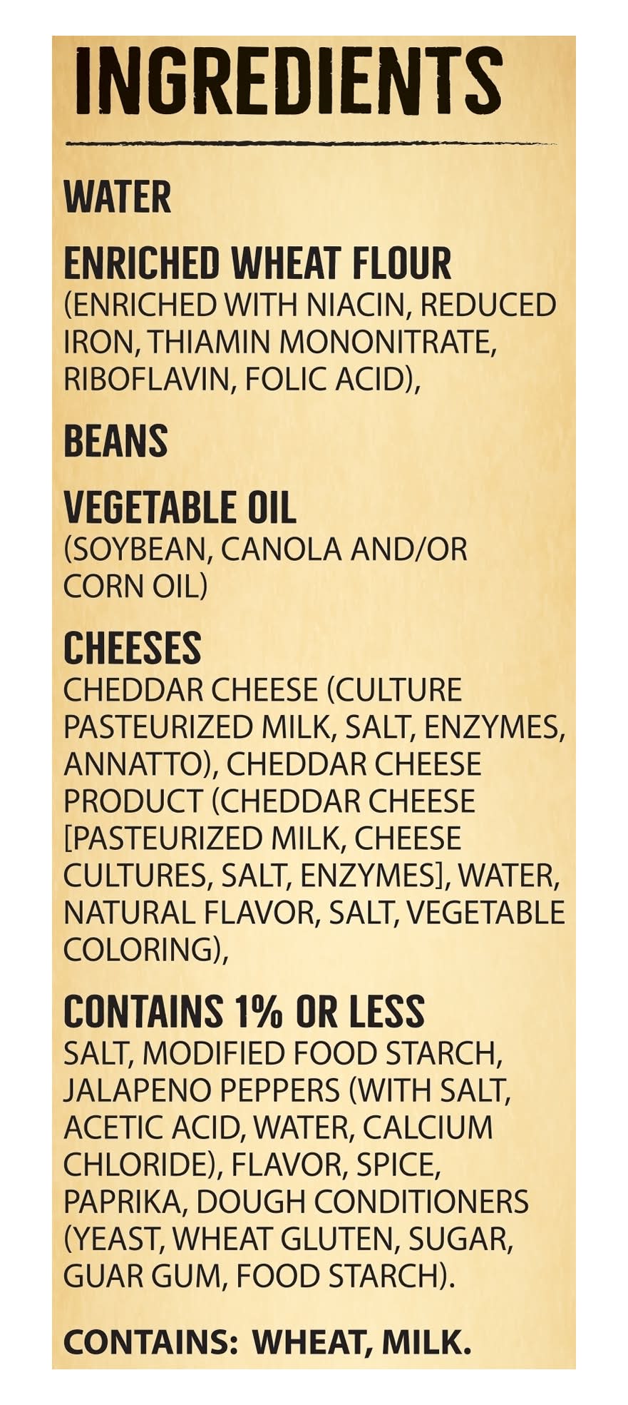 Ingredients: Water, Enriched Wheat Flour (Enriched with Niacin, Reduced Iron, Thiamin Mononitrate, Riboflavin, Folic Acid), Beans, Vegetable Oil (Soybean, Canola and/or Corn Oil), Cheeses, Cheddar Cheese (Culture Pasteurized Milk, Salt, Enzymes, Annatto), Cheddar Cheese Product (Cheddar Cheese [Pasteurized Milk, Cheese Cultures, Salt, Enzymes], Water, Natural Flavor, Salt, Vegetable Coloring), Contains 1% or Less: Salt, Modified Food Starch, Jalapeno Peppers (with Salt, Acetic Acid, Water, Calcium Chloride), Flavor, Spice, Paprika, Dough Conditioners (Yeast, Wheat Gluten, Sugar, Guar Gum, Food Starch) Contains: Wheat, Milk, Soybeans, Gluten