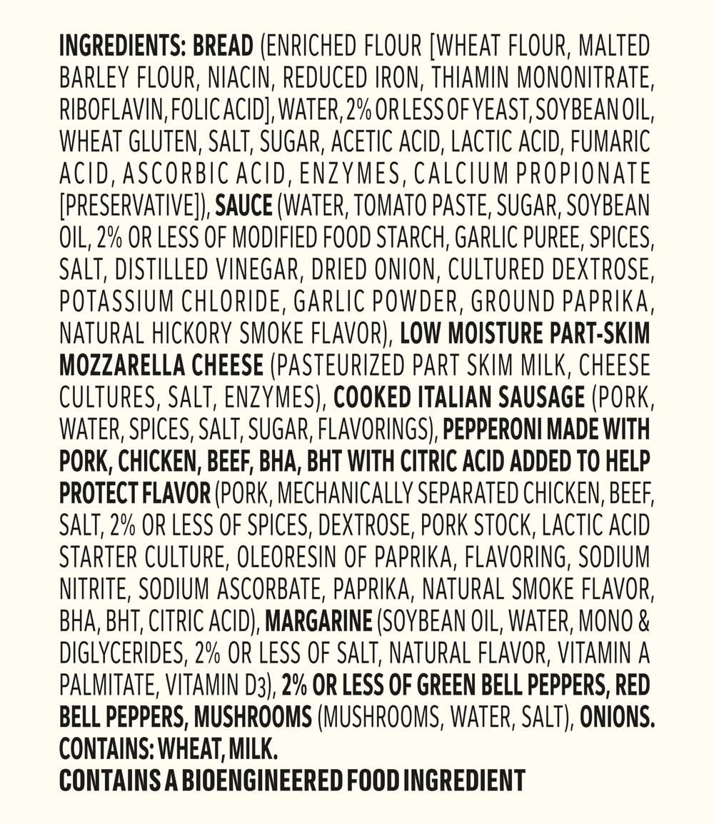 Ingredients: BREAD (ENRICHED FLOUR [WHEAT FLOUR, MALTED BARLEY FLOUR, NIACIN, REDUCED IRON, THIAMIN MONONITRATE, RIBOFLAVIN, FOLIC ACID], WATER, 2% OR LESS OF YEAST, SOYBEAN OIL, WHEAT GLUTEN, SALT, SUGAR, ACETIC ACID, LACTIC ACID, FUMARIC ACID, ASCORBIC ACID, ENZYMES, CALCIUM PROPIONATE [PRESERVATIVE]), SAUCE (WATER, TOMATO PASTE, SUGAR, SOYBEAN OIL, 2% OR LESS OF MODIFIED FOOD STARCH, GARLIC PUREE, SPICES, SALT, DISTILLED VINEGAR, DRIED ONION, CULTURED DEXTROSE, POTASSIUM CHLORIDE, GARLIC POWDER, GROUND PAPRIKA, NATURAL HICKORY SMOKE FLAVOR), LOW MOISTURE PART-SKIM MOZZARELLA CHEESE (PASTEURIZED PART-SKIM MILK, CHEESE CULTURES, SALT, ENZYMES), COOKED ITALIAN SAUSAGE (PORK, WATER, SPICES, SALT, SUGAR, FLAVORINGS), PEPPERONI MADE WITH PORK, CHICKEN, BEEF, BHA, BHT WITH CITRIC ACID ADDED TO HELP PROTECT FLAVOR (PORK, MECHANICALLY SEPARATED CHICKEN, BEEF, SALT, 2% OR LESS OF SPICES, DEXTROSE, PORK STOCK, LACTIC ACID STARTER CULTURE, OLEORESIN OF PAPRIKA, FLAVORING, SODIUM NITRITE, SODIUM ASCORBATE, PAPRIKA, NATURAL SMOKE FLAVOR, BHA, BHT, CITRIC ACID), MARGARINE (SOYBEAN OIL, WATER, MONO DIGLYCERIDES, 2% OR LESS OF SALT, NATURAL FLAVOR, VITAMIN A PALMITATE, VITAMIN D3), 2% OR LESS OF GREEN BELL PEPPERS, RED BELL PEPPERS, MUSHROOMS (MUSHROOMS, WATER, SALT), ONIONS. Contains: CONTAINS: WHEAT, MILK.