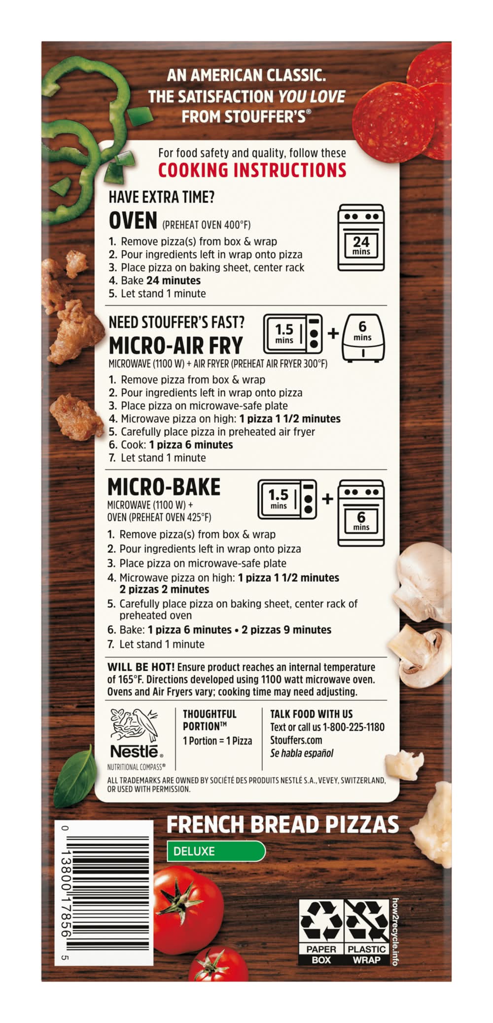 Directions for use: Directions: Cook thoroughly For food safety and quality, follow these cooking instructions. Have extra time? Oven (Preheat oven 400 degrees F). 1. Remove pizza(s) from box & wrap. 2. Pour ingredients left in wrap onto pizza. 3. Place pizza on baking sheet, center rack. 4. Bake 24 minutes. 5. Let stand 1 minute. Need Stouffer's Fast? Micro-Air Fry: Microwave (1100 W) + Air Fryer (Preheat air fryer 300 degrees F). 1. Remove pizza from box & wrap. 2. Pour ingredients left in wrap onto pizza. 3. Place pizza on microwave-safe plate. 4. Microwave pizza on high: 1 pizza 1-1/2 minutes. 5. Carefully place pizza in preheated air fryer. 6. Cook: 1 pizza 6 minutes. 7. Let stand 1 minute. Micro-Bake: Microwave (1100 W) + Oven (Preheat oven 425 degrees F). 1. Remove pizza(s) from box & wrap. 2. Pour ingredients left in wrap onto pizza. 3. Place pizza on microwave-safe plate. 4. Microwave pizza on high: 1 pizza 1-1/2 minutes; 2 pizzas 2 minutes. 5. Carefully place pizza on baking sheet. center rack of preheated oven. 6. Bake: 1 pizza 6 minutes; 2 pizzas 9 minutes. 7. Let stand 1 minute. Will be hot! Ensure product reaches an Internal temperature of 165 degrees F. Directions developed using 1100 watt microwave oven. Ovens and Air Fryers vary: cooking time may need adjusting. Keep frozen. Storage recommendation: Keep frozen.