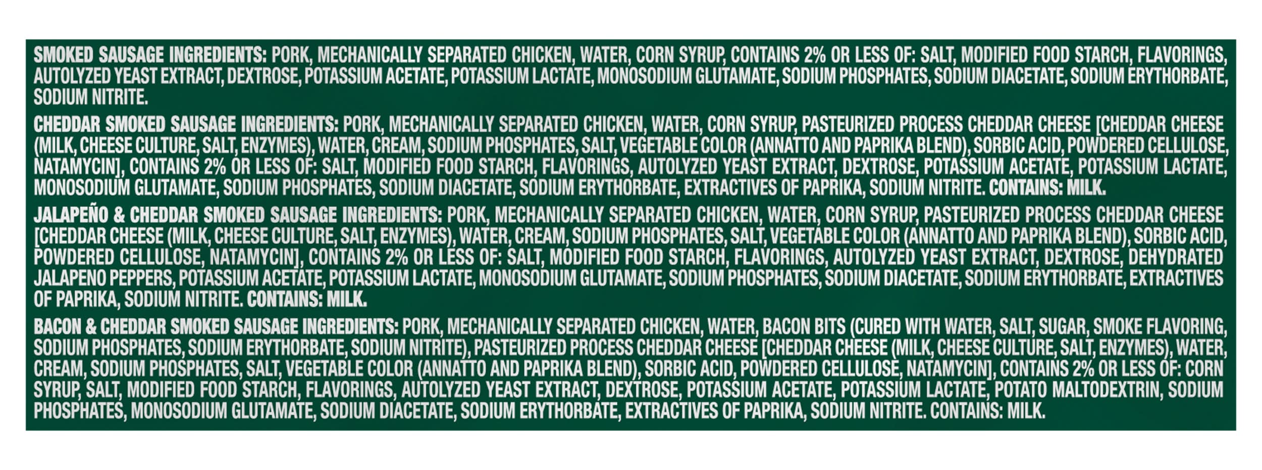 Ingredients: Meat Ingredients Pork, Beef, Mechanically Separated Turkey, Water, Corn Syrup, Contains 2% or Less of Modified Food Starch, Salt, Dextrose, Flavorings, Mechanically Separated Chicken, Autolyzed Yeast, Monosodium Glutamate, Potassium and Sodium Lactate, Sodium Phosphates, Sodium Diacetate, Ascorbic Acid Vitamin C, Sodium Nitrite. Contains: Corn