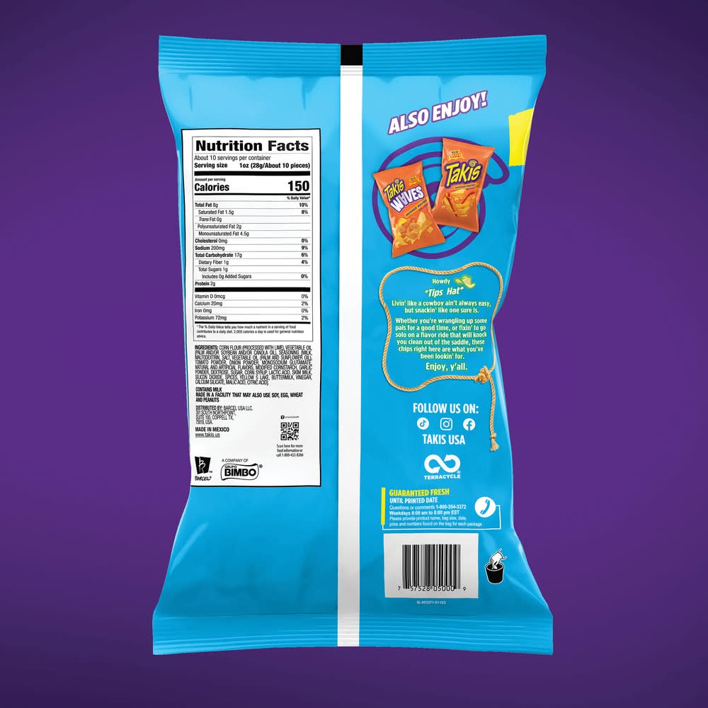 Tired of bland and boring snacks, tasteless tortilla chips, flavorless pretzels, or the same old potato chips? Change the way you munch with Takis Rolled Corn Tortilla Chips and give your taste buds the treat of deliciously intense flavor. We know the urge for a flavor-packed snack can strike at any time, leaving you in a less-than-stellar mood and putting a damper on your otherwise fantastic day. This is why we paved the way with these uniquely shaped chips that unleash tantalizing waves of flavor and fire up your tastebuds with every bite. Pack a bag to give yourself a tasty pick-me-up at school, be ready to munch away while spending the day hanging with your friends, or grab a handful for when you need a boost of flavor while hunting for new adventures. Not only are Takis rolled corn tortilla chips the ultimate snack, but they are also a great food for sharing with friends and family. Share a snack with your squad and transform a low-key hangout into a delicious celebration, or turn the vibes up to ten on your next road trip. • Flavor: Buckin’ ranch • Size: 9.9 OZ