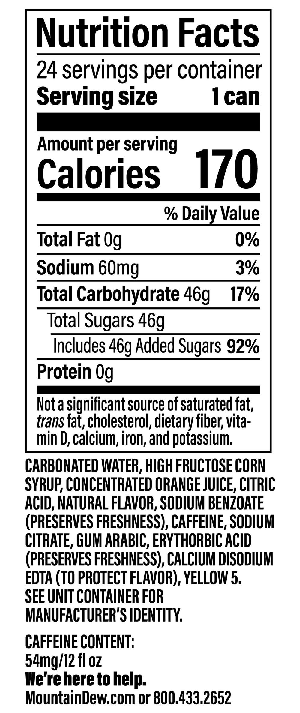 Ingredients: Carbonated Water, High Fructose Corn Syrup, Concentrated Orange Juice, Citric Acid, Natural Flavor, Sodium Benzoate (Preserves Freshness), Caffeine, Sodium Citrate, Gum Arabic, Erythorbic Acid (Preserves Freshness), Calcium Disodium Edta (To Protect Flavor), Yellow 5 Contains: Corn