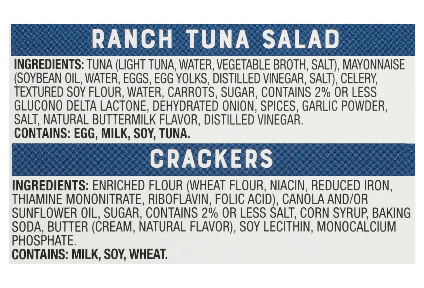 Ingredients: Ranch Tuna Salad: Tuna (Light Tuna, Water, Vegetable Broth, Salt), Mayonnaise (Soybean Oil, Water, Eggs, Egg Yolks, Distilled Vinegar, Salt), Celery, Textured Soy Flour, Water, Carrots, Sugar, Contains 2% or Less Glucono Delta Lactone, Dehydrated Onion, Spices, Garlic Powder, Salt, Natural Buttermilk Flavor, Distilled Vinegar. Crackers: Enriched Flour (Wheat Flour, Niacin, Reduced Iron, Thiamine Mononitrate, Riboflavin, Folic Acid), Canola and/or Sunflower Oil, Sugar, Contains 2% or Less Salt, Corn Syrup, Baking Soda, Butter (Cream, Natural Flavor), Soy Lecithin, Monocalcium Phosphate. Contains: Eggs, Milk, Soybeans, Fish, Tuna, Celery, Wheat, Corn