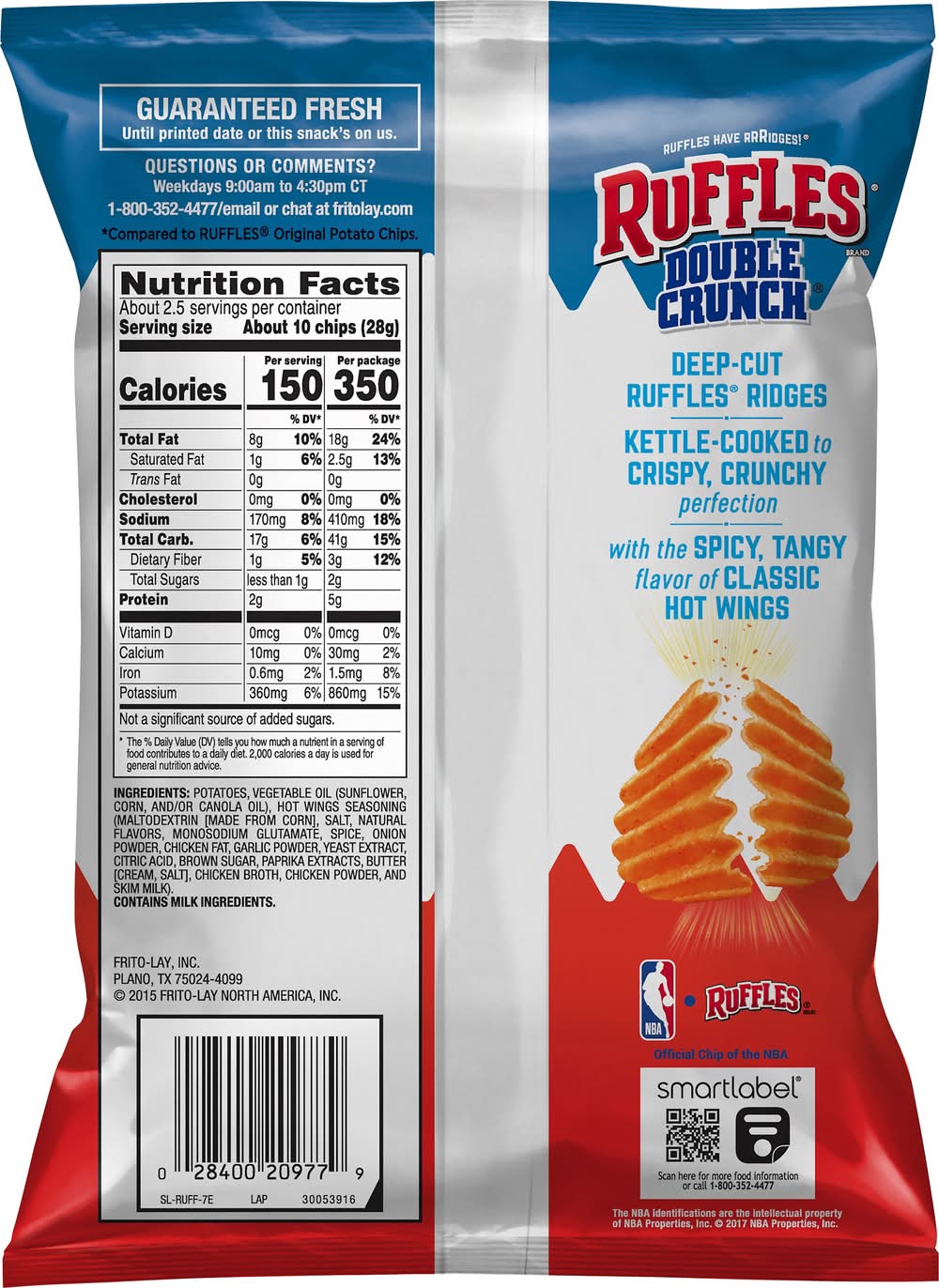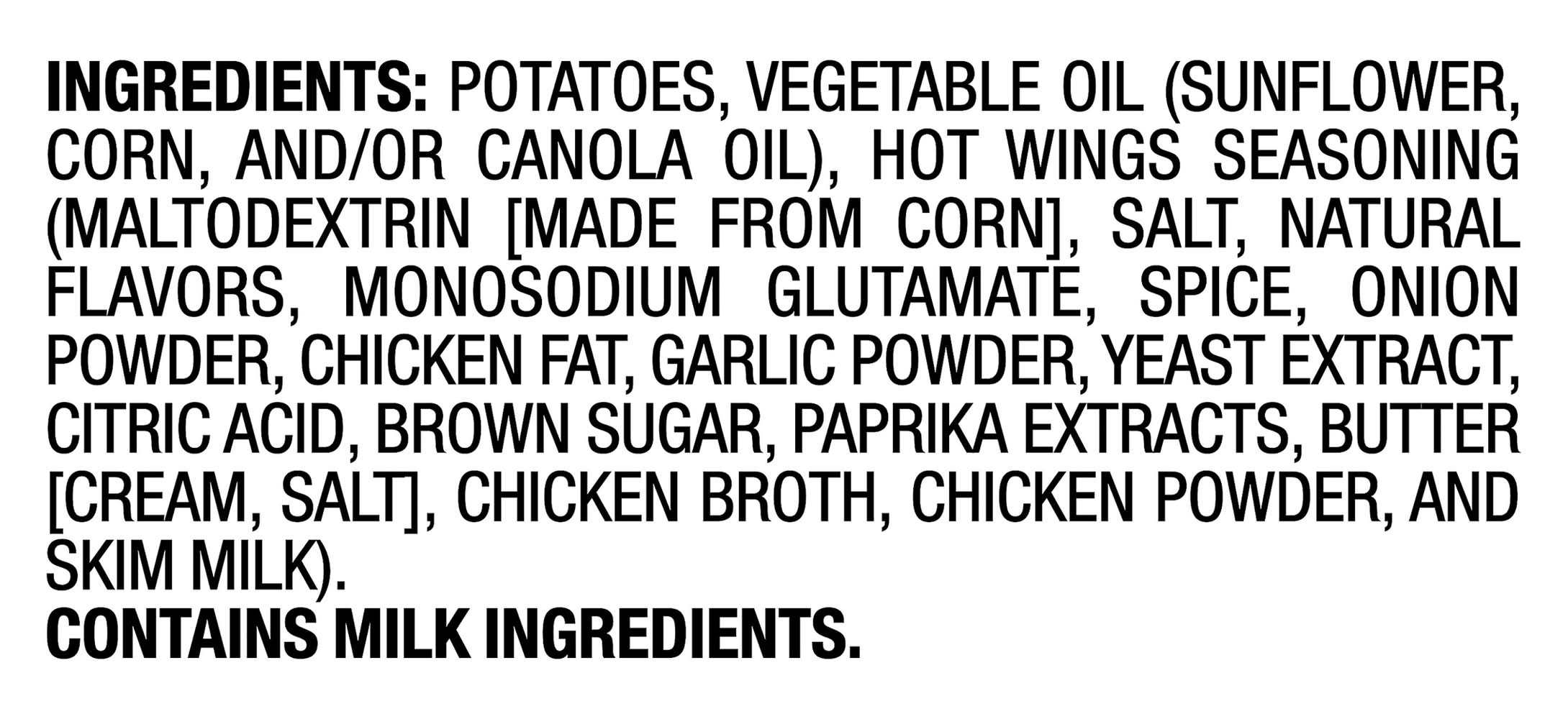 Ingredients: Potatoes, Vegetable Oil (Sunflower, Corn, and/or Canola Oil), Hot Wings Seasoning (Maltodextrin [Made from Corn], Salt, Natural Flavors, Monosodium Glutamate, Spice, Onion Powder, Chicken Fat, Garlic Powder, Yeast Extract, Citric Acid, Brown Sugar, Paprika Extracts, Butter (Cream, Salt], Chicken Broth, Chicken Powder, and Skim Milk) Contains: Milk, Corn