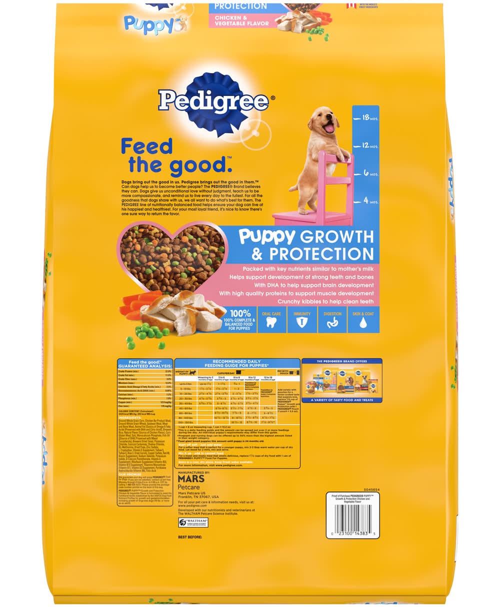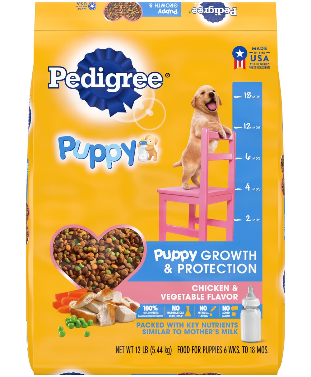 PEDIGREE Puppy Growth and Protection Chicken & Vegetable Flavor Dog Food is formulated to help your pup keep up with the big dogs. This dry food formula is made with DHA for healthy canine brain development, plus calcium and phosphorus for healthy teeth and strong bones in young dogs. No high fructose corn syrup, no artificial flavors, and no added sugar. With PEDIGREE Puppy Food, it's never been easier to give your growing dog a complete and balanced meal in a savory kibble they will love. Size: 12 LB