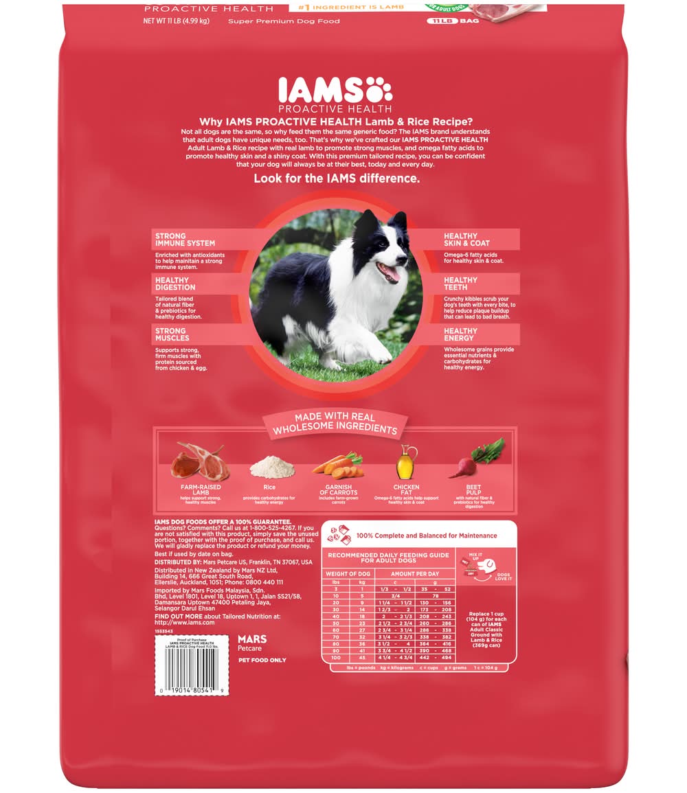 Directions: best if used by date on bag. recommended daily feeding guide for adult dogs. weight of dog: 3 lbs (1 kg); amount per day: 1/3 cups (35 g). weight of dog: 10 lbs (5 kg); amount per day: 3/4 cups (78 g). weight of dog: 20 lbs (9 kg); amount per day: 1-1/4 - 1-1/2 cups (130 - 156 g). weight of dog: 30 lbs (14 kg); amount per day: 1-2/3 - 2 cups (174 - 208 g). weight of dog: 40 lbs (18 kg); amount per day: 2 - 2-1/3 cups (208 - 243 g). weight of dog: 50 lbs (23 kg); amount per day: 2-1/2 - 2-3/4 cups (260 - 286 g). weight of dog: 60 lbs (27 kg); amount per day: 2-3/4 - 3-1/4 cups (286 - 338 g). weight of dog: 70 lbs (32 kg); amount per day: 3-1/4 - 3-2/3 cups (338 - 382 g). weight of dog: 80 lbs (36 kg); amount per day: 3-1/2 - 4 cups (364 - 416 g). weight of dog: 90 lbs (41 kg); amount per day: 3-3/4 - 4-1/2 cups (390 - 468 g). weight of dog: 100 lbs (45 kg); amount per day: 4-1/4 - 4-3/4 cups (442 - 494 g). lbs = pounds; kg = kilograms; g = grams; c = cups; 1 c = 104 g. mix it up. dogs love it. replace 1 cup (104 g) for each can of iams lamb and rice (369g can). . feeding guidelines: these guideline amounts are a starting point and your dog may need more food depending upon age, activity and temperament. in order to reach optimal body condition, you may need to adjust food intake. this represents the total recommended volume of food per day. you should divide the total recommended feeding amount by the number of times you feed your dog per day to get the actual portion size per feeding. remember to have clean, fresh water available for your dog at all times. because iams proactive health lamb & rice recipe adult dog food is complete and balanced for adult dogs, you do not need to add vitamin or mineral supplements. when introducing iams dog food, gradually mix it with your dog's current food over the course of 4 days.