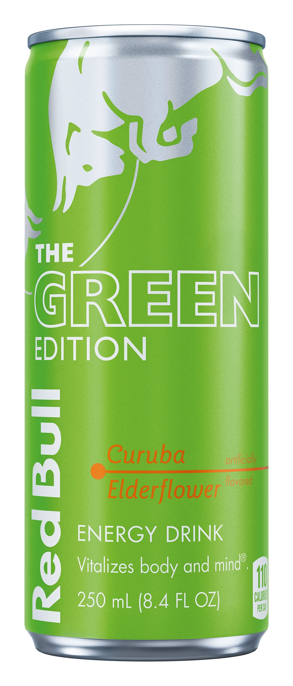 This Red Bull Green Edition features a burst of Curuba, Citrus, Melon, and an Elderflower finish. This lightly carbonated beverage is enjoyed worldwide by fitness enthusiasts, athletes, gamers, students and travelers. A refreshing can of Red Bull makes an excellent partner for busy, active lifestyles. Each 8.4 fl oz can contains 80mg of caffeine per serving and 26g of sugar. Comes in aluminum cans that can be recycled over and over. Always check can labels for most updated product nutritional and ingredient information. Calcium and sugars values declared on labels may vary slightly depending on production locations. Always check can labels for most updated product nutritional and ingredient information. Calcium and sugars values declared on labels may vary slightly depending on production locations. • Flavor: Curuba elderflower • Size: 8.4 OZ