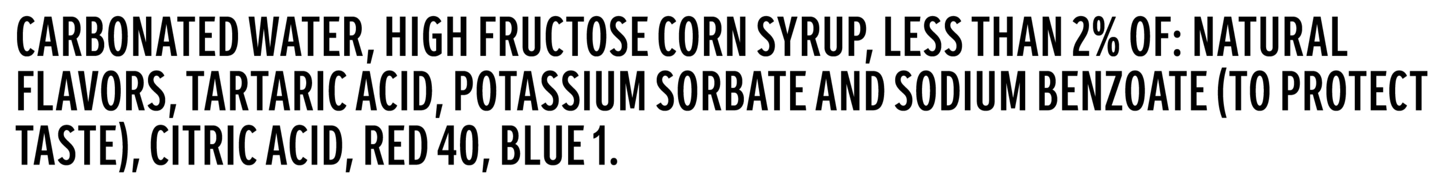 Ingredients: Carbonated Water, High Fructose Corn Syrup, Natural Flavors, Tartaric Acid, Citric Acid, Blue 1.