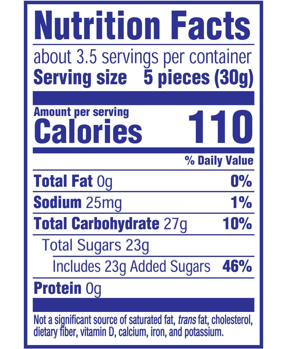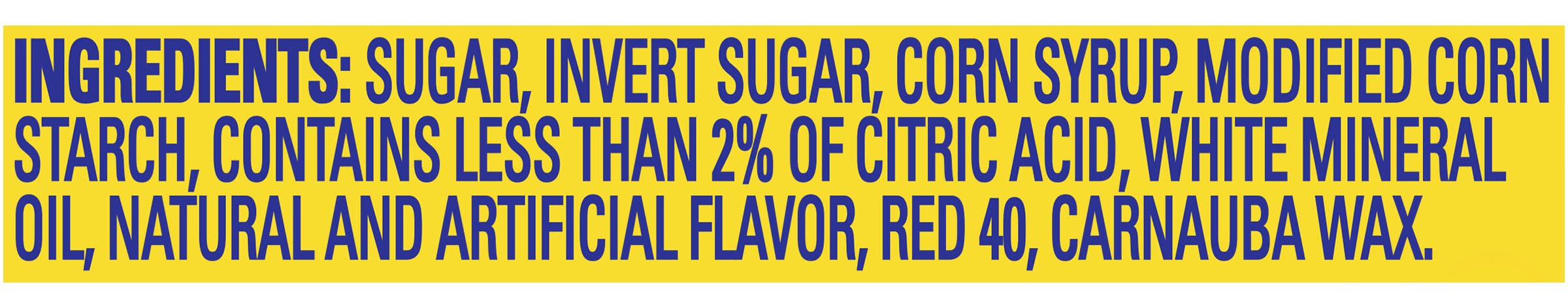 Ingredients: Sugar, Invert Sugar, Corn Syrup, Modified Corn Starch, Contains Less than 2% of Citric Acid, White Mineral Oil, Natural and Artificial Flavor, Red 40, Carnauba Wax