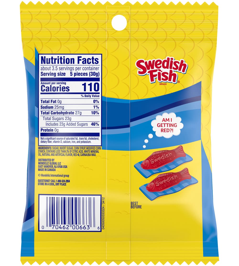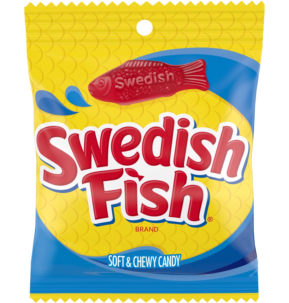 Swedish Fish Soft & Chewy Candy is a fun sweet snack to share and enjoy. The classic flavor of Swedish Fish gummy snacks floods your mouth with a delicious fruity taste, while the signature red candy fish shape adds a bit of fun to your candy experience. This flavored candy makes a great sweet treat for multiple occasions; keep Swedish Fish on-hand for quick snacks or as party favors for holidays or birthdays. This soft candy also makes a great movie theater candy to snack on during your favorite flick and a fun Halloween candy for trick-or-treaters. Each package of bagged candy is the perfect size for stashing in purses, backpacks and lunchboxes for chewy snacks on-the-go. • Flavor: Fruit • Size: 4 OZ • Mondelez Global Llc, East Hanover, NJ 07936