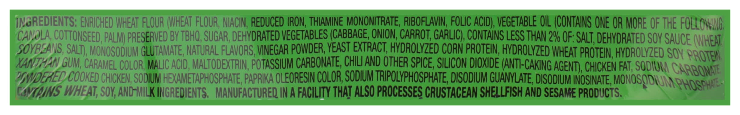Ingredients: Enriched Wheat Flour (Wheat Flour, Niacin, Reduced Iron, Thiamine Mononitrate, Riboflavin, Folic Acid), Vegetable Oil (Contains One or More of the Following: Canola, Cottonseed, Palm) Preserved by TBHQ, Sugar, Dehydrated Vegetables (Cabbage, Onion, Carrot, Garlic), Contains Less than 2% of: Salt, Dehydrated Soy Sauce, (Wheat Soybeans, Salt), Monosodium Glutamate, Natural Flavors, Vinegar Powder, Yeast Extract, Hydrolyzed Soy Protein, Hydrolyzed Wheat Protein, Hydrolyzed Soy Protein, Xanthan Gum, Caramel Color, Malic Acid, Maltodextrin, Potassium Carbonate, Chili and Other Spice, Silicon Dioxide (Anti-Caking Agent), Chicken Fat, Sodium Carbonate, Powdered Cooked Chicken, Sodium Hexametaphosphate, Paprika Oleoresin Color, Sodium Tripolyphosphate, Disodium Guanylate, Disodium Inosinate, Monosodium Phosphate Contains: Soybeans, Milk, Wheat, Crustacean Shellfish, Sesame