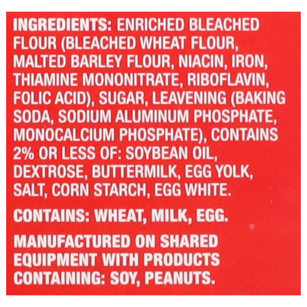 Ingredients: Enriched Bleached Flour (Bleached Wheat Flour, Malted Barley Flour, Niacin, Iron, Thiamine Mononitrate, Riboflavin, Folic Acid), Sugar, Leavening (Baking Soda, Sodium Aluminum Phosphate, Monocalcium Phosphate), Contains 2% or Less of: Soybean Oil, Dextrose, Buttermilk, Egg Yolk, Salt, Corn Starch, Egg White Contains: Wheat, Milk, Eggs, Barley, Soybeans, Peanuts