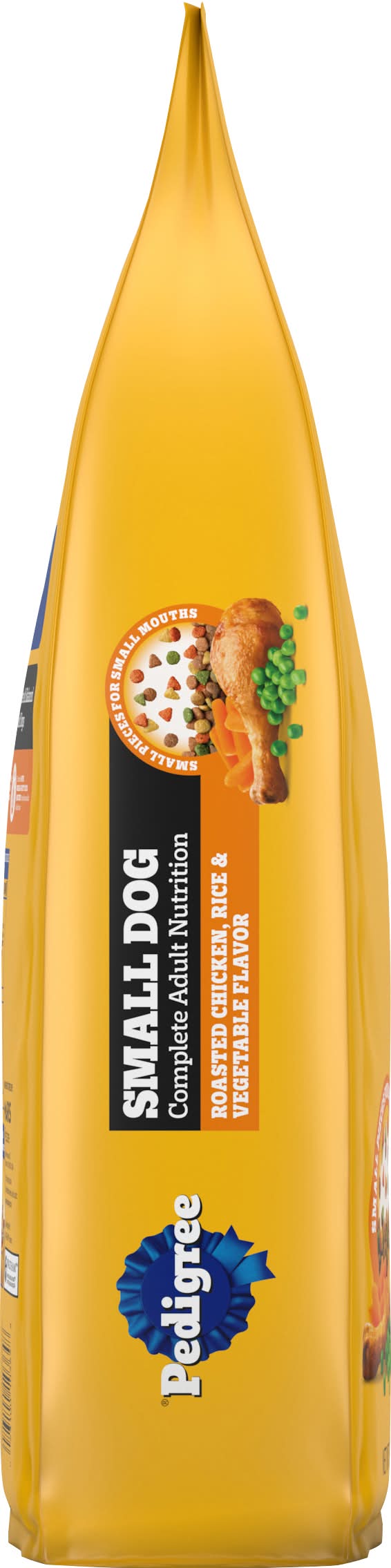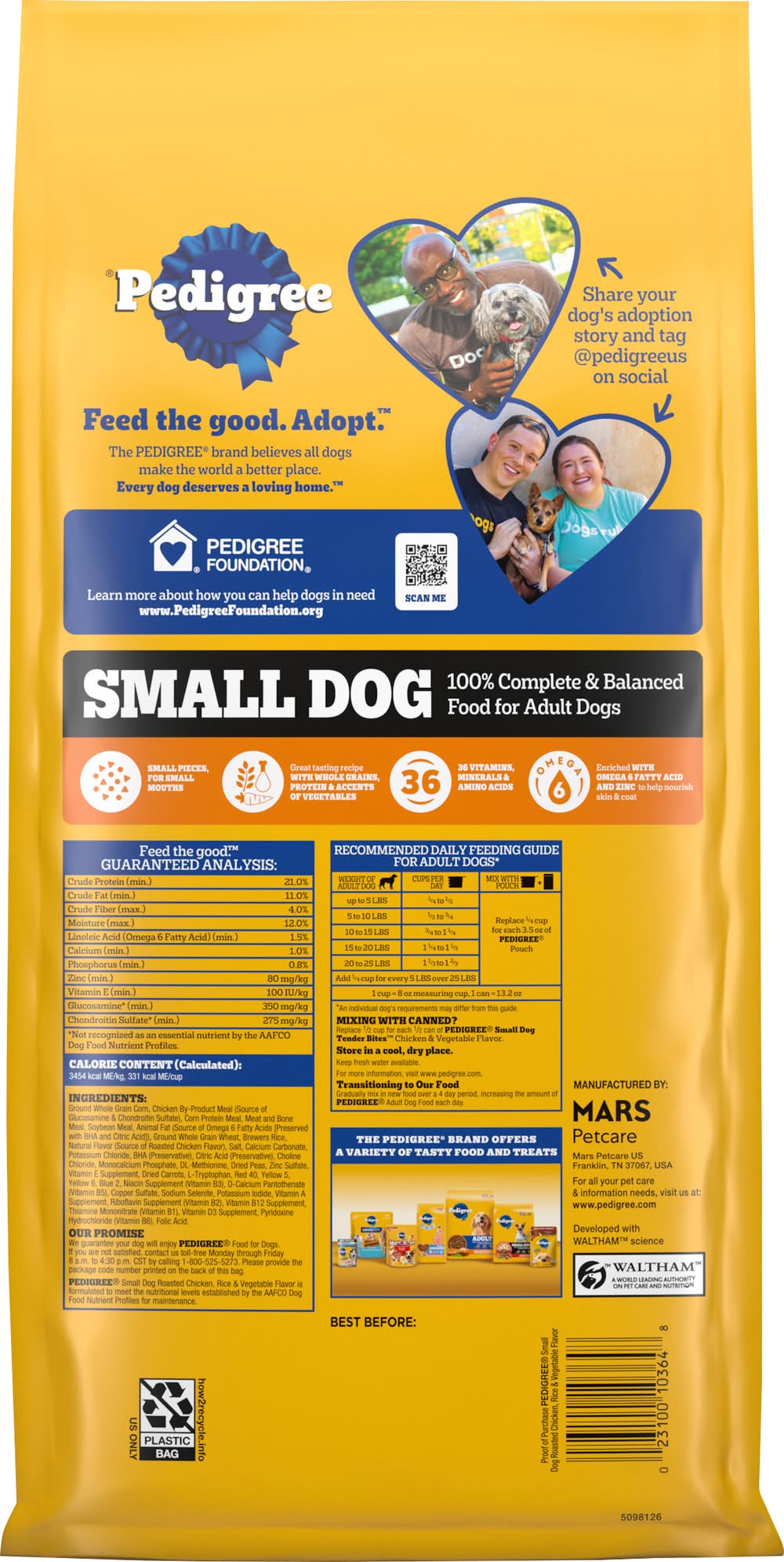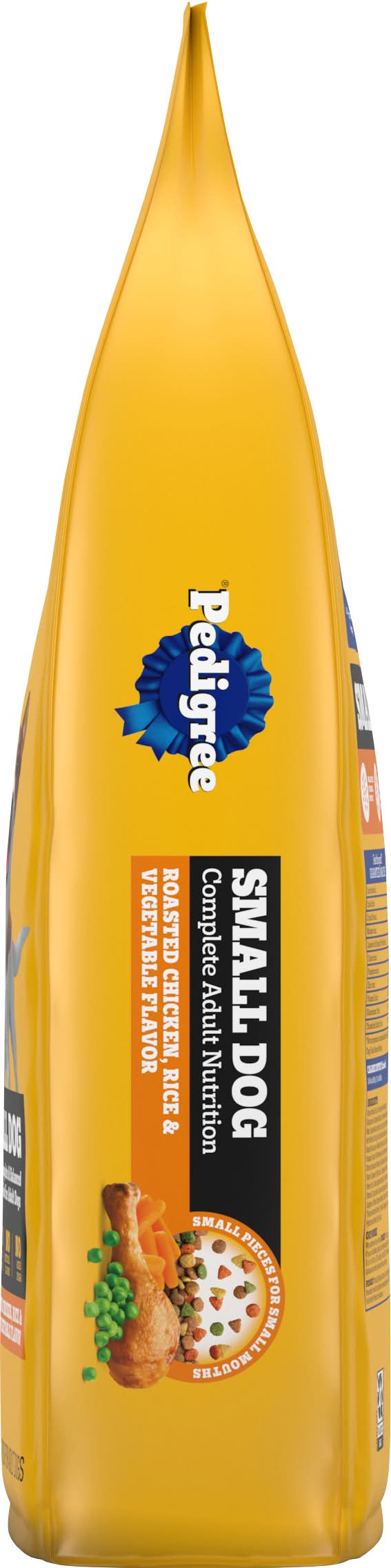 Even little dogs need a large amount of nutrition. That's why every bag of PEDIGREE Small Dog Roasted Chicken, Rice & Vegetable Flavor Dry Dog Food has the vitamins and minerals small breed dogs need to be healthy and happy. Made with high quality whole grains, protein and omega-6 fatty acids, PEDIGREE Small Dog Food helps your canine look and feel their best. Best of all, our oral care kibble gently cleans their teeth with every bite. Now with no high fructose corn syrup, no artificial flavors, and no added sugar. • Size: Small & Adult • Mars Petcare US, Franklin,TN,37067,USA