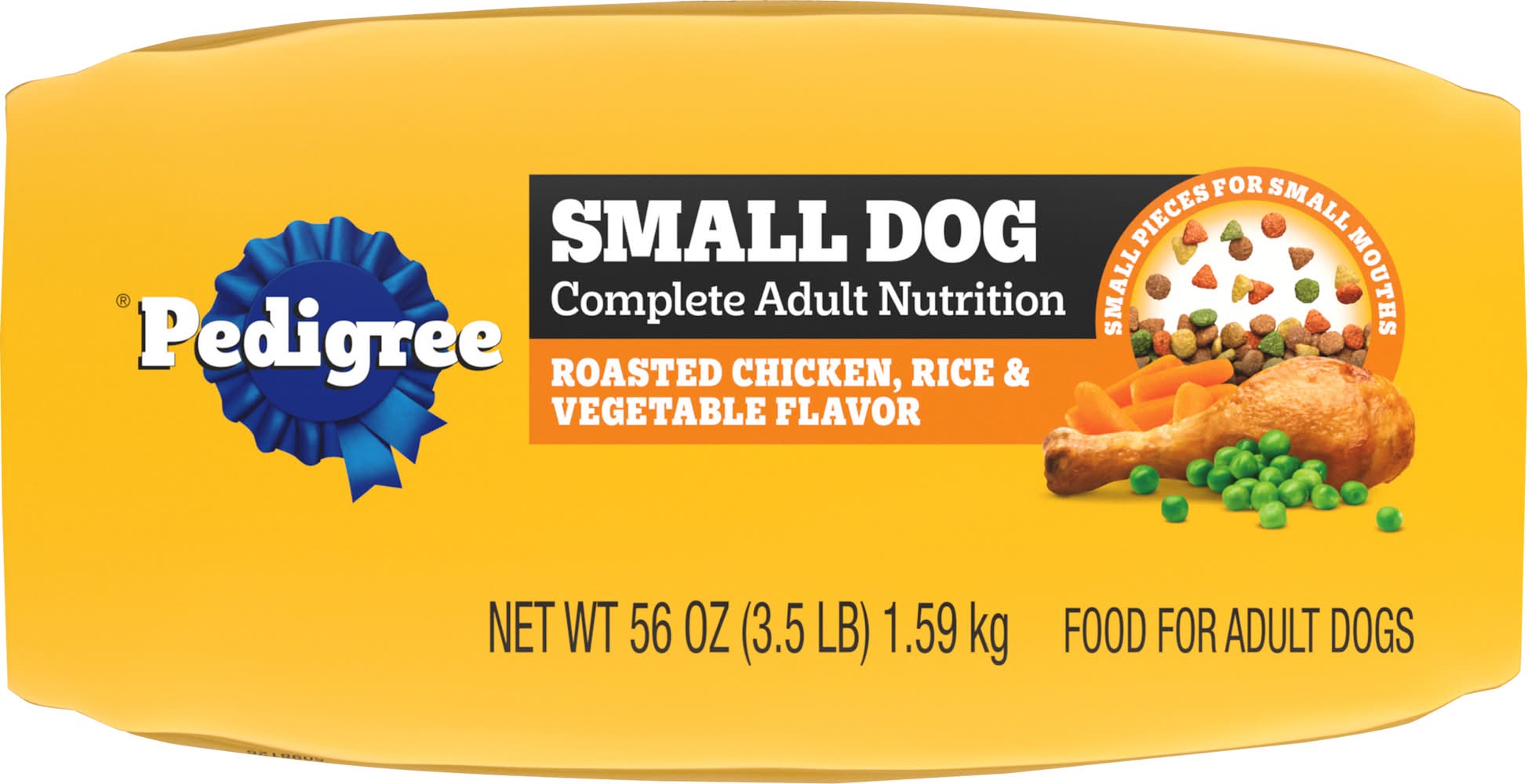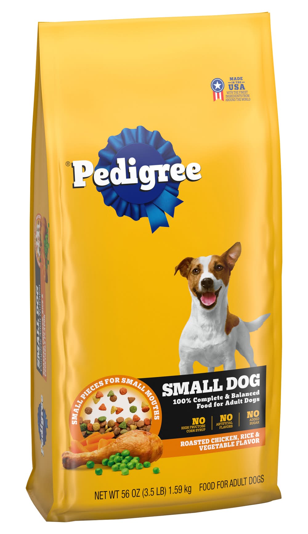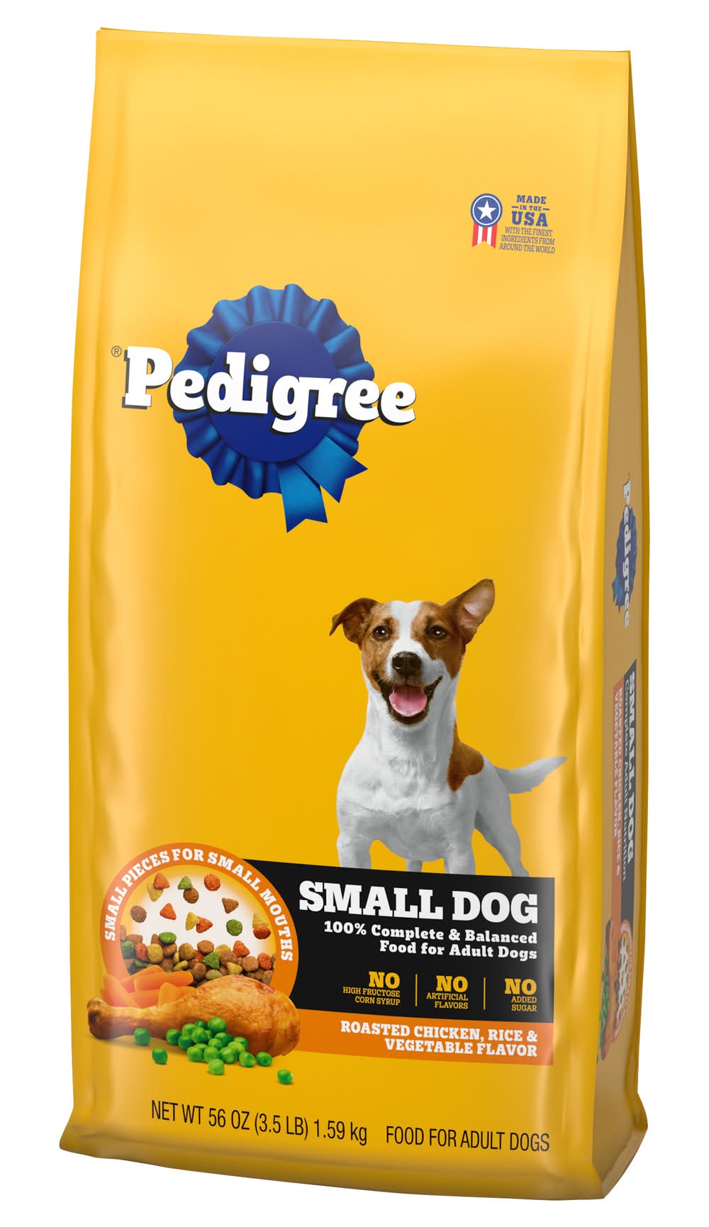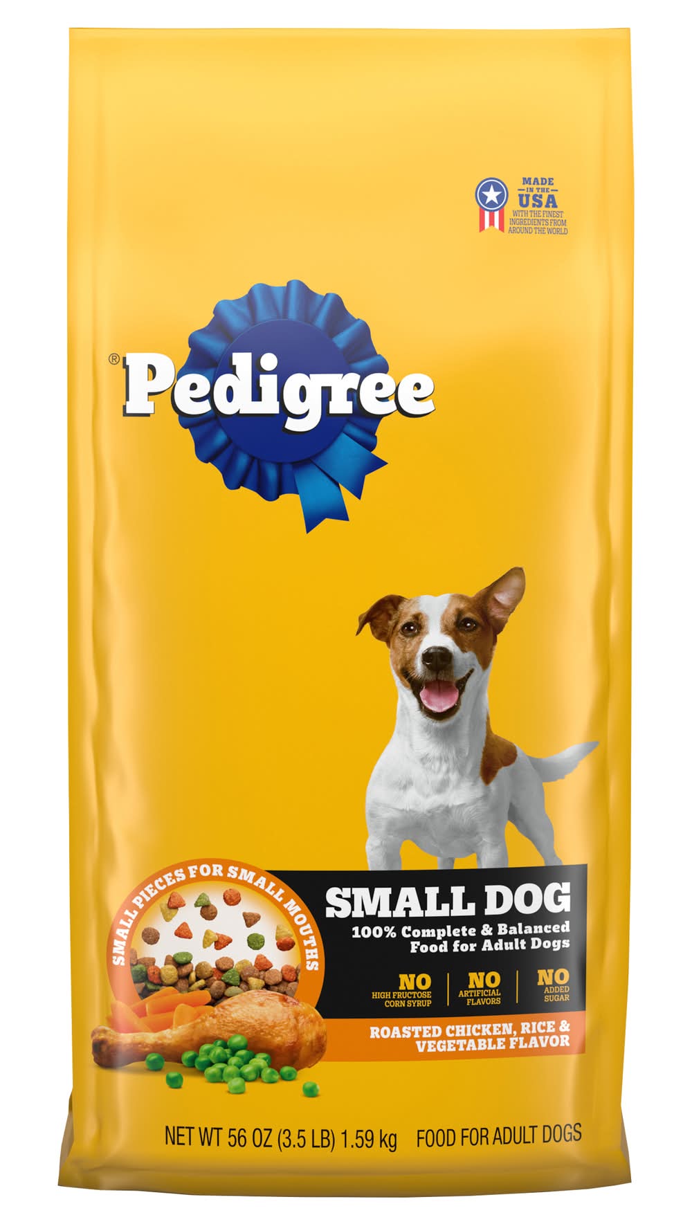 Even little dogs need a large amount of nutrition. That's why every bag of PEDIGREE Small Dog Roasted Chicken, Rice & Vegetable Flavor Dry Dog Food has the vitamins and minerals small breed dogs need to be healthy and happy. Made with high quality whole grains, protein and omega-6 fatty acids, PEDIGREE Small Dog Food helps your canine look and feel their best. Best of all, our oral care kibble gently cleans their teeth with every bite. Now with no high fructose corn syrup, no artificial flavors, and no added sugar. • Size: Small & Adult • Mars Petcare US, Franklin,TN,37067,USA