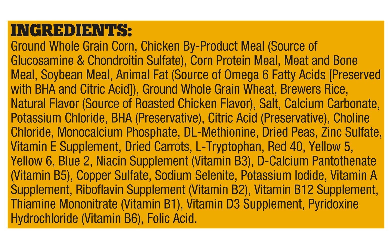 Ingredients: Ground Whole Grain Corn, Chicken By-Product Meal (Source of Glucosamine & Chondroitin Sulfate), Corn Protein Meal, Meat and Bone Meal, Soybean Meal, Animal Fat (Source of Omega 6 Fatty Acids [Preserved with BHA and Citric Acid]), Ground Whole Grain Wheat, Brewers Rice, Natural Flavor (Source of Roasted Chicken Flavor), Salt, Calcium Carbonate, Potassium Chloride, BHA (Preservative), Citric Acid (Preservative), Choline Chloride, Monocalcium Phosphate, DL-Methionine, Dried Peas, Zinc Sulfate, Vitamin E Supplement, Dried Carrots, L-Tryptophan, Red 40, Yellow 5, Yellow 6, Blue 2, Niacin Supplement (Vitamin B3), D-Calcium Pantothenate (Vitamin B5), Copper Sulfate, Sodium Selenite, Potassium Iodide, Vitamin a Supplement, Riboflavin Supplement (Vitamin B2), Vitamin B12 Supplement, Thiamine Mononitrate (Vitamin B1), Vitamin D3 Supplement, Pyridoxine Hydrochloride (Vitamin B6), Folic Acid Contains: Soybeans, Wheat