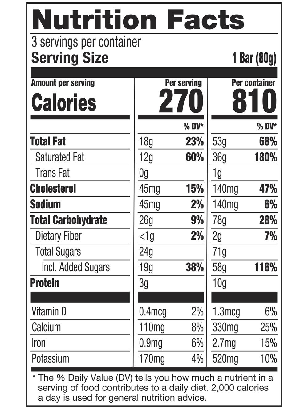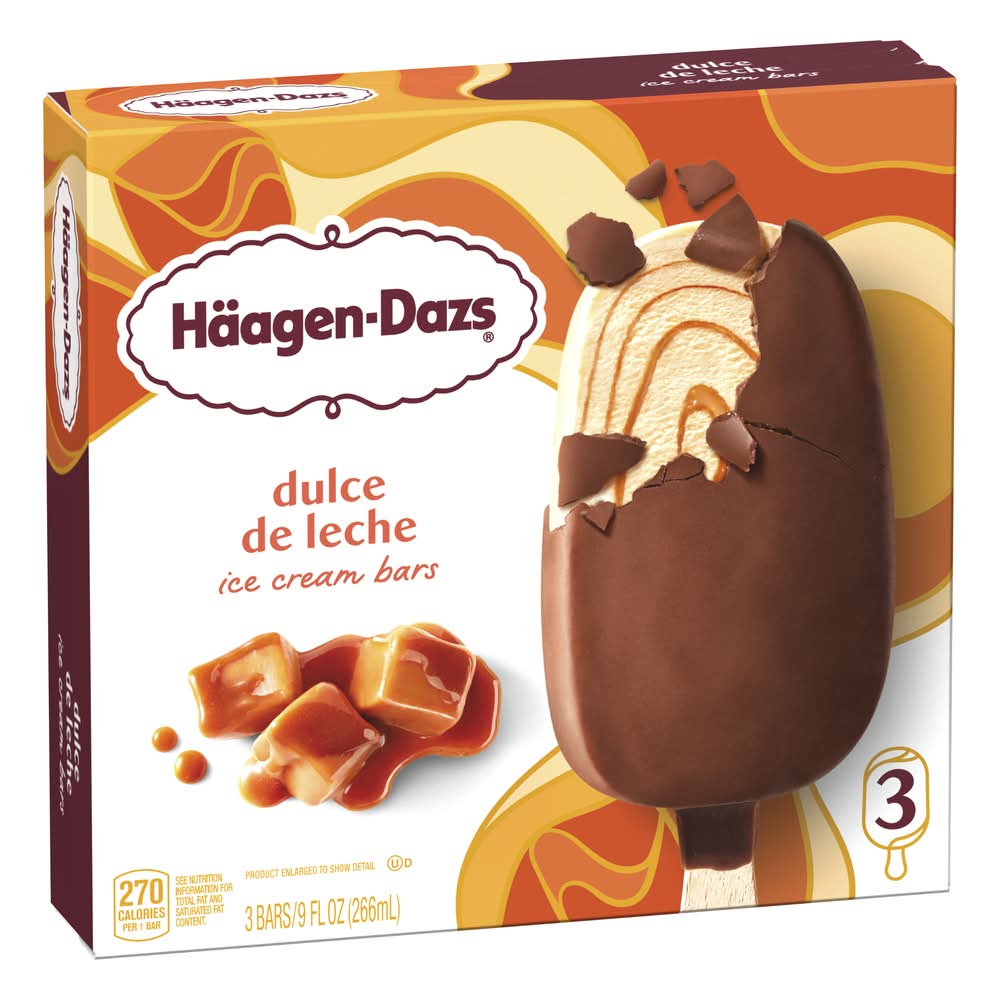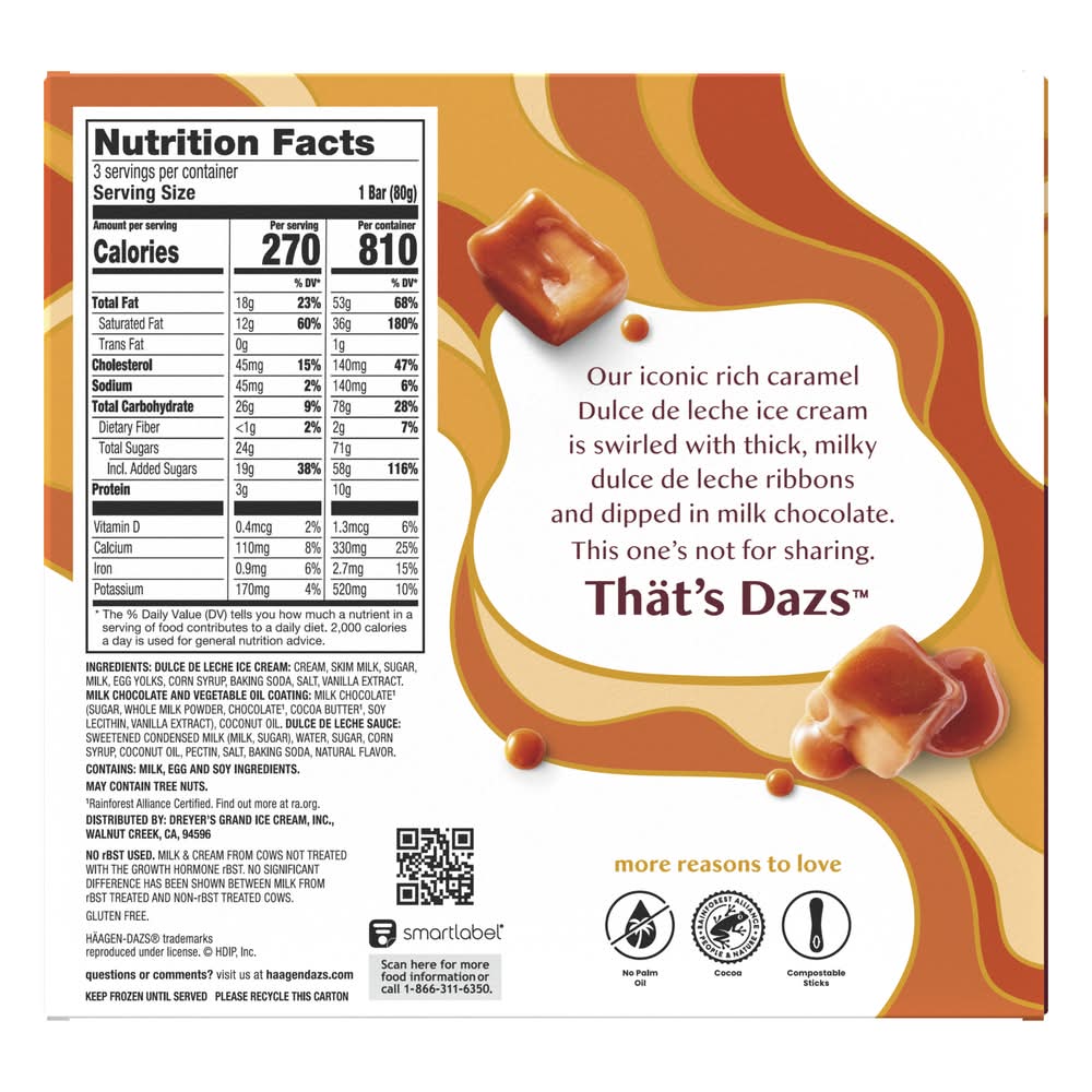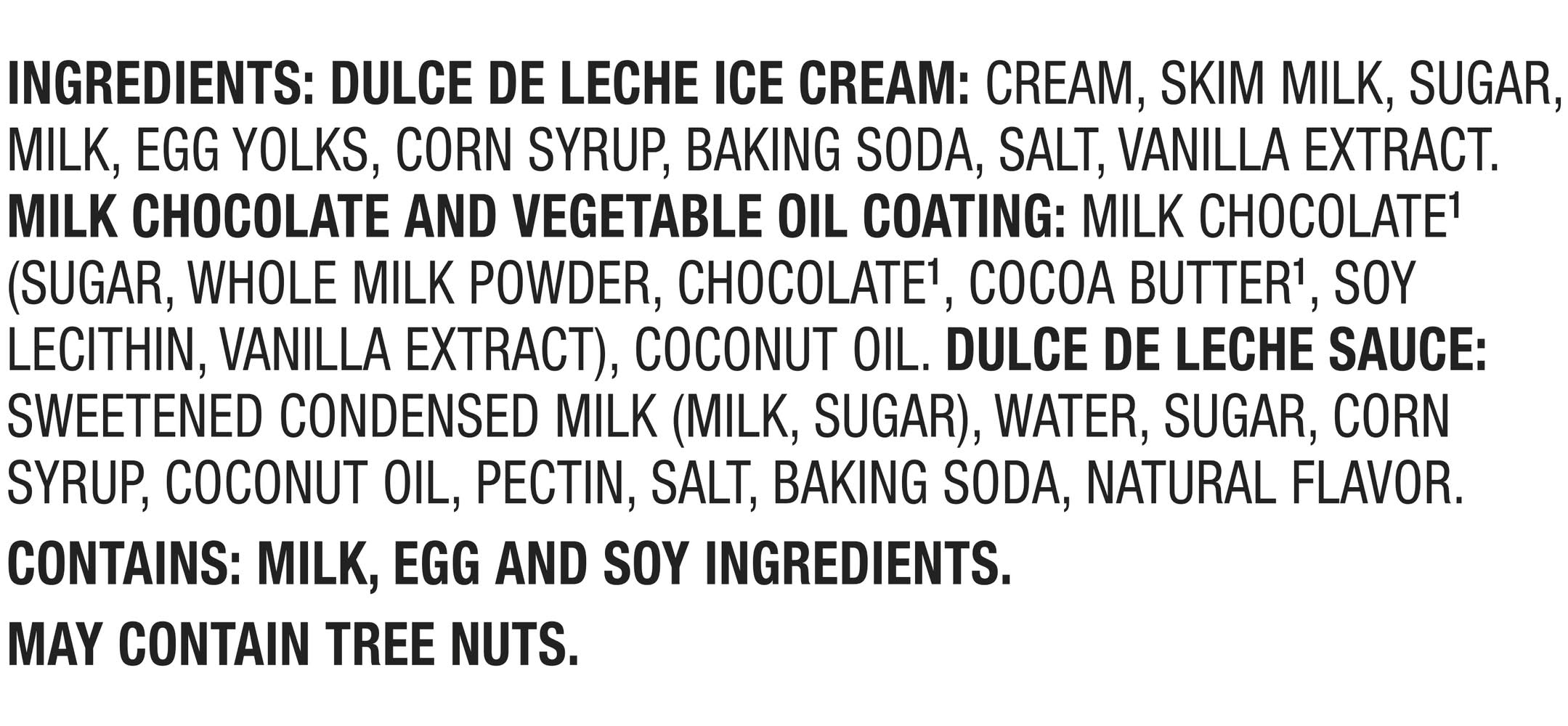 Ingredients: Dulce De Leche Ice Cream: Cream, Skim Milk, Sugar, Milk, Egg Yolks, Corn Syrup, Baking Soda, Salt, Vanilla Extract, Milk Chocolate and Vegetable Oil Coating: Milk Chocolate (Rainforest Alliance Certified Find Out More at RaOrg) (Sugar Whole Milk Powder Chocolate (Rainforest Alliance Certified Find Out More at RaOrg), Cocoa Butter (Rainforest Alliance Certified Find Out More at RaOrg), Soy Lecithin, Vanilla Extract), Coconut Oil, Dulce De Leche Sauce: Sweetened Condensed Milk (Milk Sugar), Water, Sugar, Corn Syrup, Coconut Oil, Pectin, Salt, Baking Soda, Natural Flavor Contains: Milk, Eggs, Corn, Soybeans