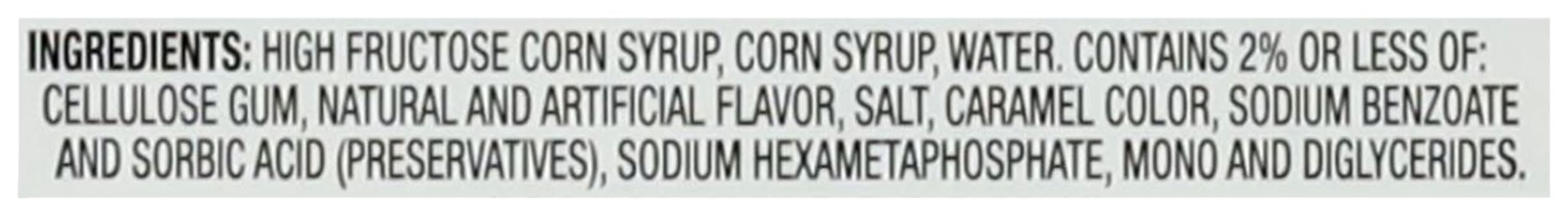 Ingredients: High Fructose Corn Syrup, Corn Syrup, Water, Contains 2% or Less of: Cellulose Gum, Natural and Artificial Flavor, Salt, Caramel Color, Sodium Benzoate and Sorbic Acid (Preservatives), Sodium Hexametaphosphate, Mono and Diglycerides
