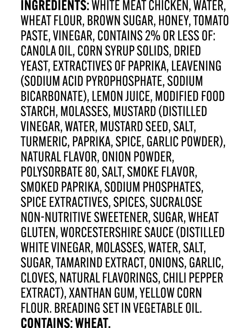 Ingredients: White Meat Chicken, Water, Wheat Flour, Brown Sugar, Honey, Tomato Paste, Vinegar, Contains 2% Or Less Of: Canola Oil, Corn Syrup Solids, Dried Yeast, Extractives Of Paprika, Leavening (Sodium Acid Pyrophosphate, Sodium Bicarbonate), Lemon Juice, Modified Food Starch, Molasses, Mustard (Distilled Vinegar, Water, Mustard Seed, Salt, Turmeric, Paprika, Spice, Garlic Powder), Natural Flavor, Onion Powder, Polysorbate 80, Salt, Smoke Flavor, Smoked Paprika, Sodium Phosphates, Spice Extractives, Spices, Sucralose Non-Nutritive Sweetener, Sugar, Wheat Gluten, Worcestershire Sauce (Distilled White Vinegar, Molasses, Water, Salt, Sugar, Tamarind Extract, Onions, Garlic, Cloves, Natural Flavorings, Chili Pepper Extract), Xanthan Gum, Yellow Corn Flour. Breading Set In Vegetable Oil. Contains: Wheat