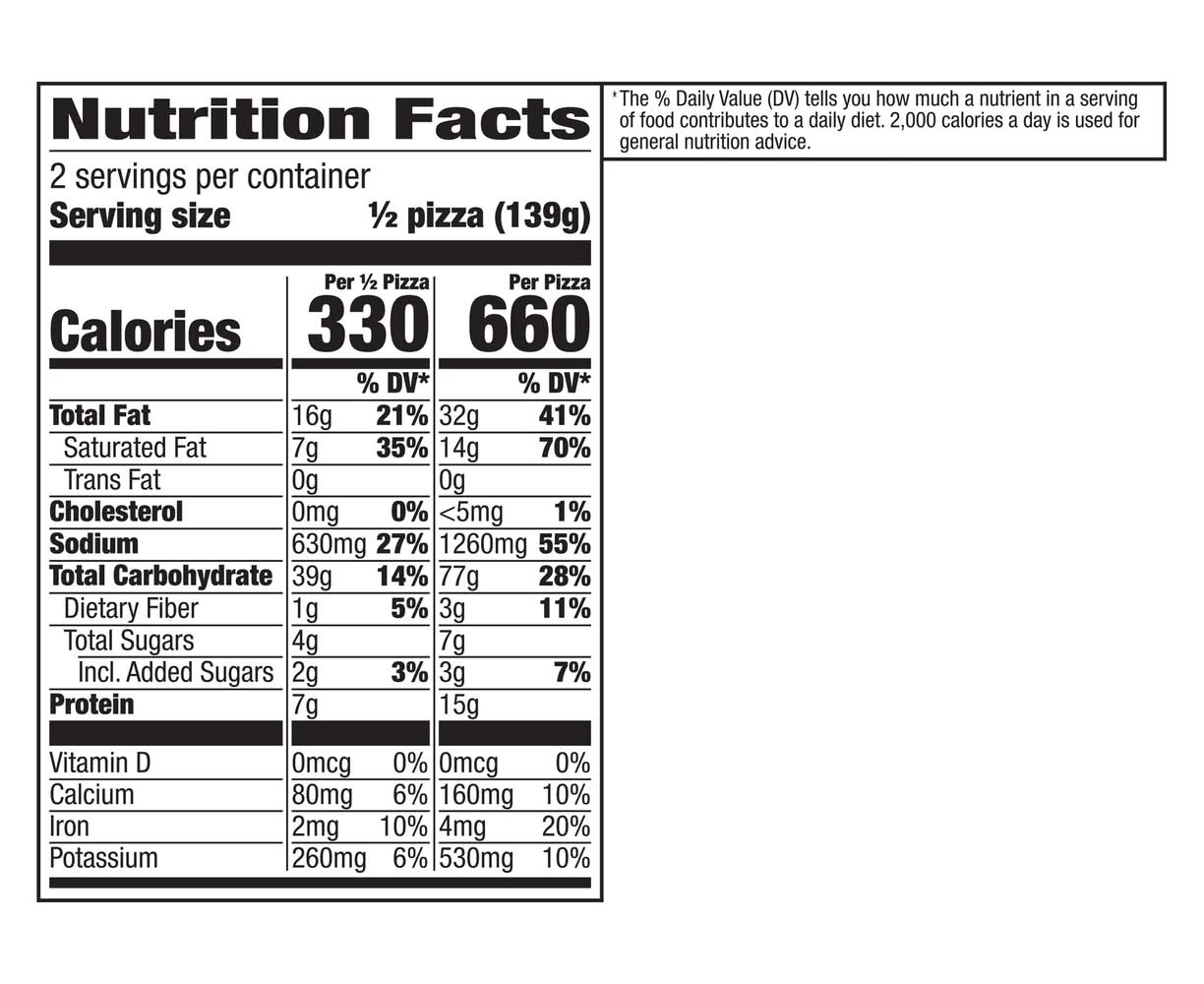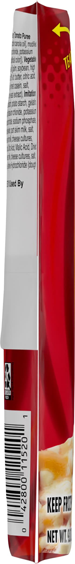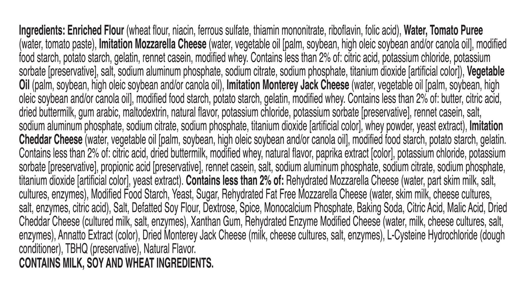 Ingredients: Enriched Flour (Wheat Flour, Niacin, Ferrous Sulfate, Thiamin Mononitrate, Riboflavin, Folic Acid), Water, Tomato Puree (Water, Tomato Paste), Imitation Mozzarella Cheese (Water, Vegetable Oil [Palm, Soybean, High Oleic Soybean and/or Canola Oil], Modified Food Starch, Potato Starch, Gelatin, Rennet Casein, Modified Whey. Contains less than 2% of: Citric Acid, Potassium Chloride, Potassium Sorbate [Preservative], Salt, Sodium Aluminum Phosphate, Sodium Citrate, Sodium Phosphate, Titanium Dioxide [Artificial Color]), Vegetable Oil (Palm, Soybean, High Oleic Soybean and/or Canola Oil) Contains: Milk, Soybeans, Wheat