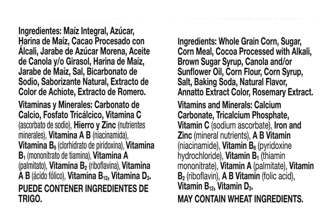 Ingredients: Whole Grain Corn, Sugar, Corn Meal, Cocoa Processed with Alkali, Brown Sugar Syrup, Canola and/or Sunflower Oil, Corn Flour, Corn Syrup, Salt, Baking Soda, Natural Flavor, Annatto Extract Color, Rosemary Extract, Vitamins and Minerals: Calcium Carbonate, Tricalcium Phosphate, Vitamin C (Sodium Ascorbate), Iron and Zinc (Mineral Nutrients), A B Vitamin (Niacinamide), Vitamin B6 (Pyridoxine Hydrochloride), Vitamin B1 (Thiamin Mononitrate) Vitamin A (Palmitate), Vitamin B2 (Riboflavin), A B Vitamin (Folic Acid), Vitamin B12, Vitamin D3 Contains: Corn, Wheat