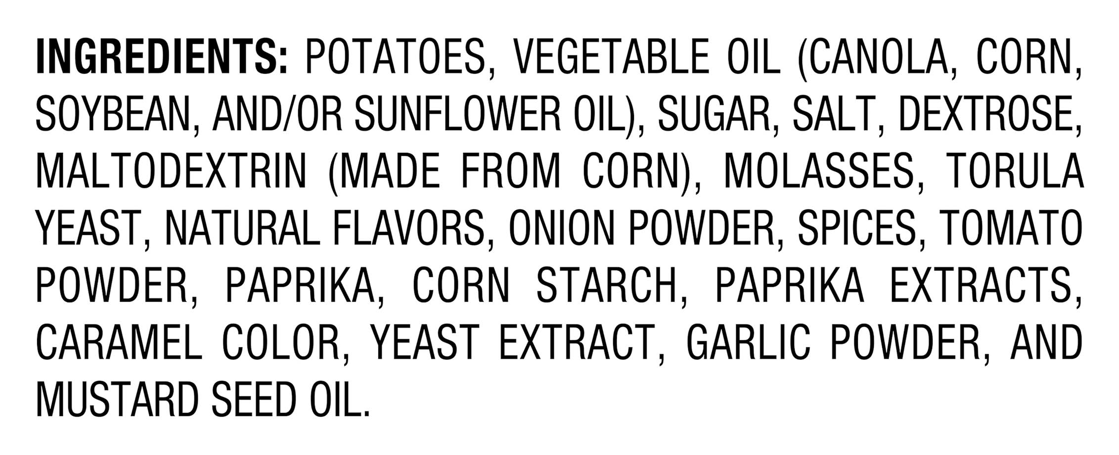 Ingredients: Potatoes, Vegetable Oil (Canola, Corn, Soybean, and/or Sunflower Oil), Sugar, Salt, Dextrose, Maltodextrin (Made from Corn), Molasses, Torula Yeast, Natural Flavors, Onion Powder, Spices, Tomato Powder, Paprika, Corn Starch, Paprika Extracts, Caramel Color, Yeast Extract, Garlic Powder, and Mustard Seed Oil Contains: Soybeans, Mustard