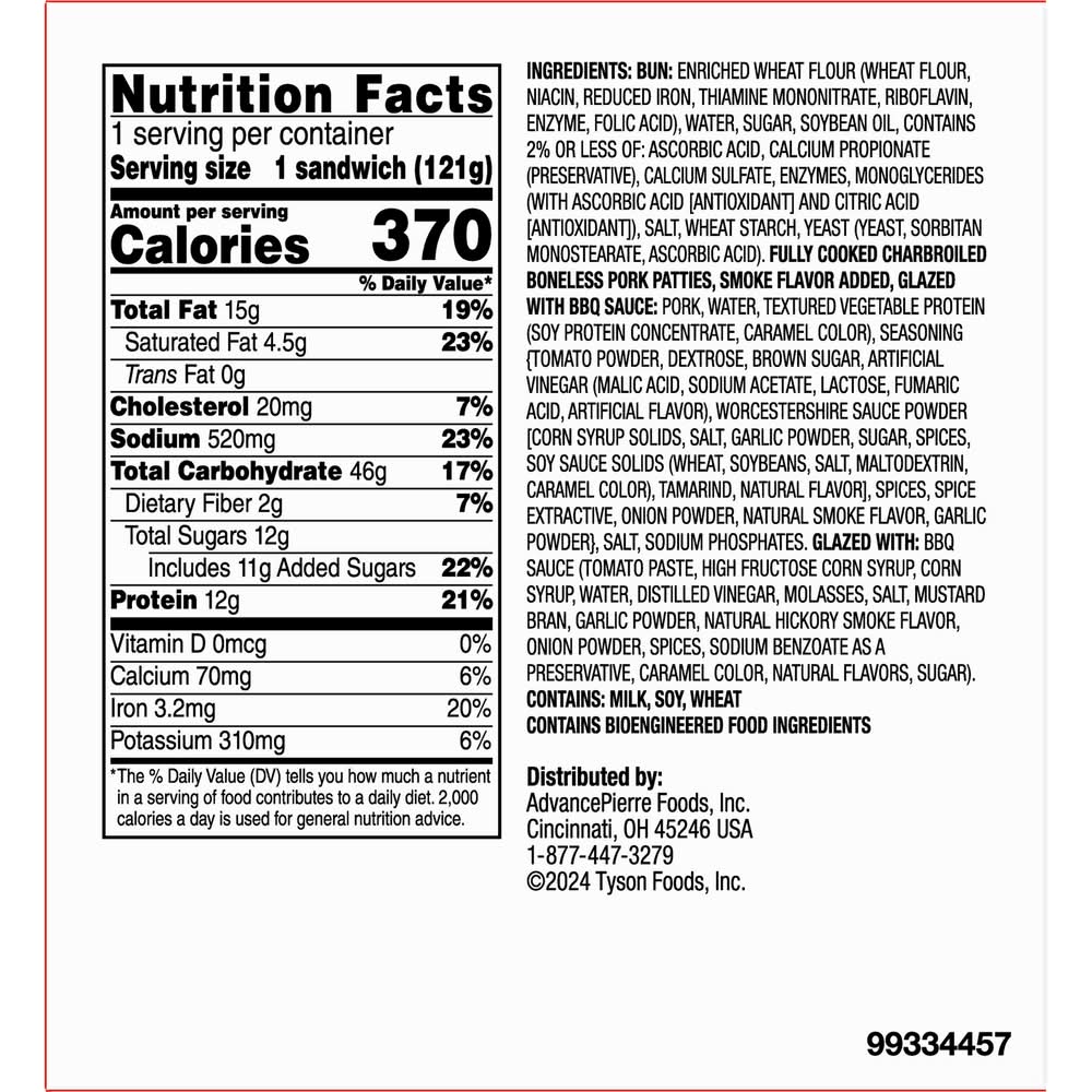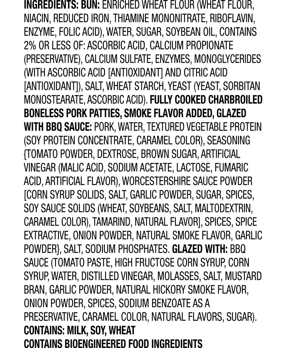 Ingredients: BUN: Enriched wheat flour (wheat flour, niacin, reduced iron, thiamine mononitrate, riboflavin, enzyme, folic acid), water, sugar, soybean oil, Contains 2% or less of: ascorbic acid, calcium propionate (preservative), calcium sulfate, enzymes, monoglycerides (with ascorbic acid [antioxidant] and citric acid [antioxidant]), salt, wheat starch, yeast (yeast, sorbitan monostearate, ascorbic acid). FULLY COOKED CHARBROILED BONELESS PORK PATTIES, SMOKE FLAVOR ADDED, GLAZED WITH BBQ SAUCE: Pork, water, textured vegetable protein (soy protein concentrate, caramel color), seasoning {tomato powder, dextrose, brown sugar, artificial vinegar (malic acid, sodium acetate, lactose, fumaric acid, artificial flavor), Worcestershire sauce powder [corn syrup solids, salt, garlic powder, sugar, spices, soy sauce solids (wheat, soybeans, salt, maltodextrin, caramel color), tamarind, natural flavor], spices, spice extractive, onion powder, natural smoke flavor, garlic powder}, salt, sodium phosphates. GLAZED WITH: BBQ Sauce (tomato paste, high fructose corn syrup, corn syrup, water, distilled vinegar, molasses, salt, mustard bran, garlic powder, natural hickory smoke flavor, onion powder, spices, sodium benzoate as a preservative, caramel color, natural flavors, sugar).