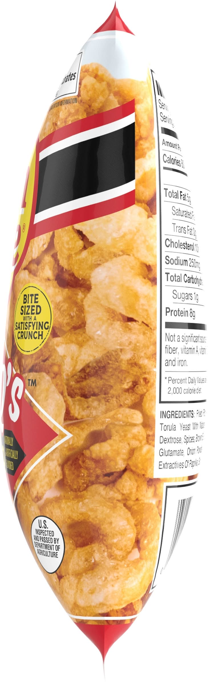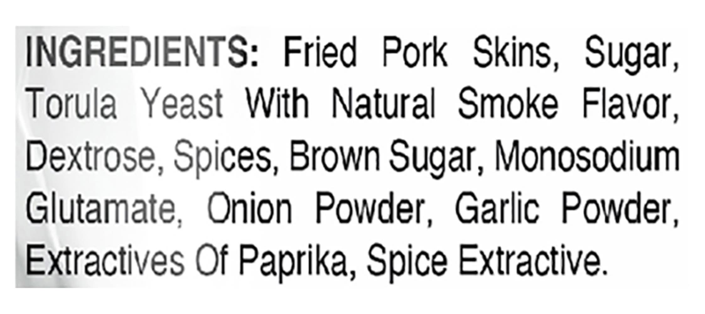 Ingredients: Fried Pork Skins, Sugar, Torula Yeast with Natural Smoke Flavor, Dextrose, Spices, Brown Sugar, Monosodium Glutamate, Onion Powder, Garlic Powder, Extractives of Paprika, Spice Extractive