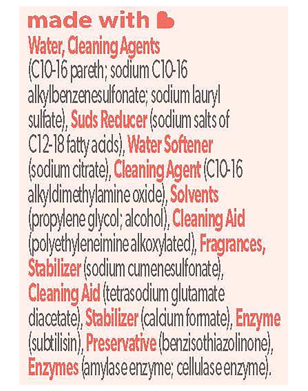 Ingredients: Made with: Water, Cleaning Agents (C10-16 Pareth, Sodium C10-16 Alkylbenzenesulfonate; Sodium Lauryl Sulfate), Suds Reducer (Sodium Salts Of C12-18 Fatty Acids), Water Softener (Sodium Citrate), Cleaning Agent (C10-16 Alkyldimethylamine Oxide), Solvent (Propylene Glycol; Alcohol), Cleaning Aid (Polyethyleneimine Alkoxylated), Fragrances, Stabilizers (Sodium Cumenesulfonate), Cleaning Aid (Tetrasodium Glutamate Diacetate), Stabilizer (Calcium Formate), Enzyme (Subtilisin), Preservative (Benzisothiazolinone), Enzyme (Amylase Enzyme; Cellulase Enzyme)