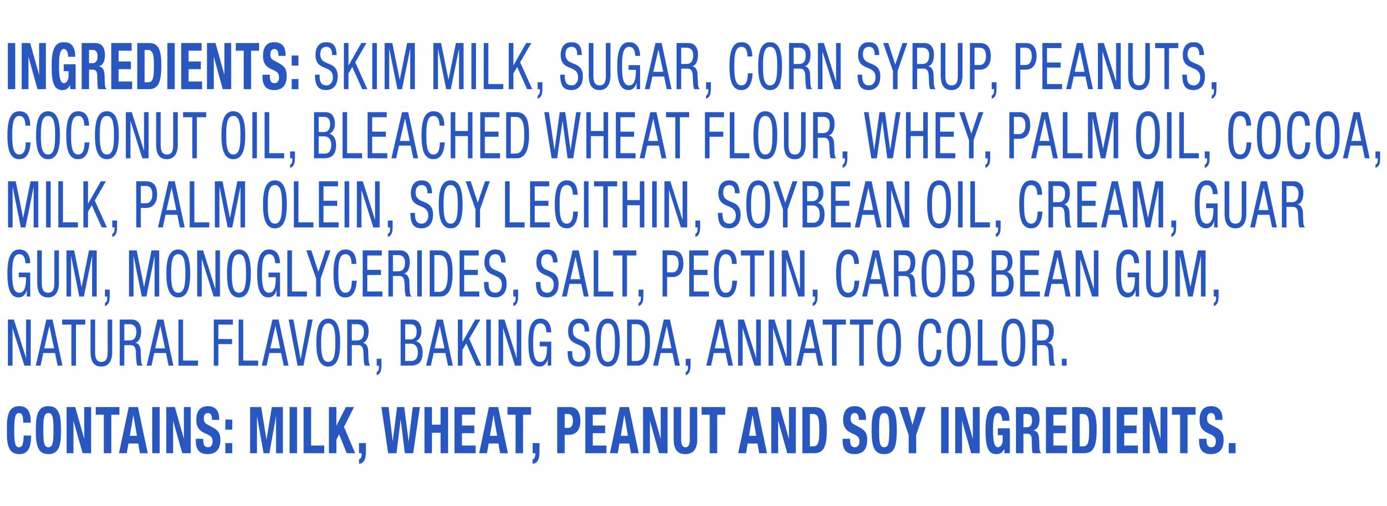 Ingredients: SKIM MILK, SUGAR, CORN SYRUP, PEANUTS, WHEY, COCONUT OIL, BLEACHED WHEAT FLOUR, PALM OLEIN, COCOA¹, MILK, PALM OIL AND, OR SOYBEAN OIL, SOY LECITHIN, CREAM, GUAR GUM, MONOGLYCERIDES, SALT, PECTIN, CAROB BEAN GUM, NATURAL FLAVOR, BAKING SODA, ANNATTO COLOR. Contains: MILK, WHEAT, PEANUT AND SOY INGREDIENTS.