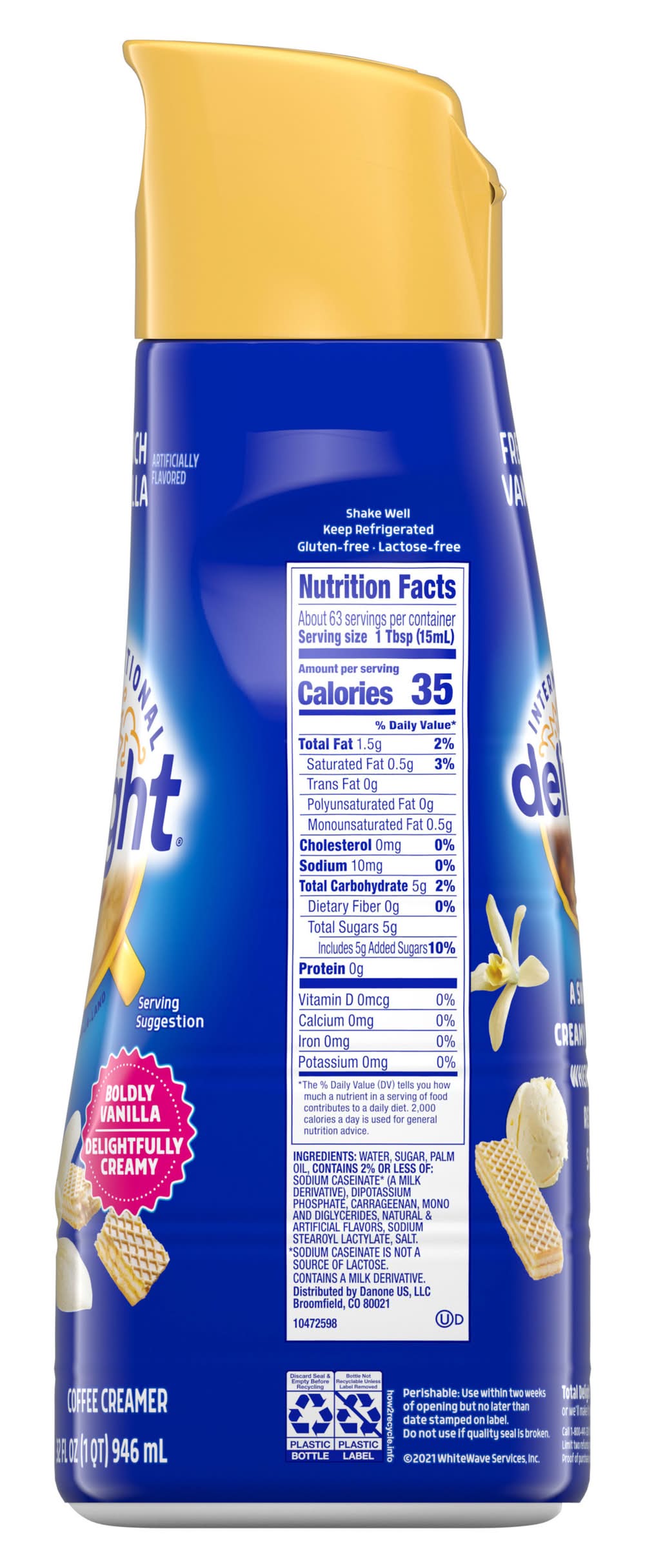 International Delight French Vanilla Coffee Creamer is the world of flavor your coffee's been waiting for. With vanilla flavor so bold, you'll be swept off your feet. And creaminess so delightful, you'll wonder why black coffee ever existed. Add some of our French Vanilla flavored creamer to dial up the joy in everyday moments. Check out all of the International Delight liquid creamer flavors to bring some excitement to your coffee break. Plus, International Delight Creamers are lactose free and gluten free, so they're easy to share. Fill your room with some International Delight Liquid Coffee Creamer or mess up your whole dang day. • Flavor: French vanilla • Size: 32 OZ • Danone US, LLC, Broomfield,CO,80021 • Packaging: Reusable