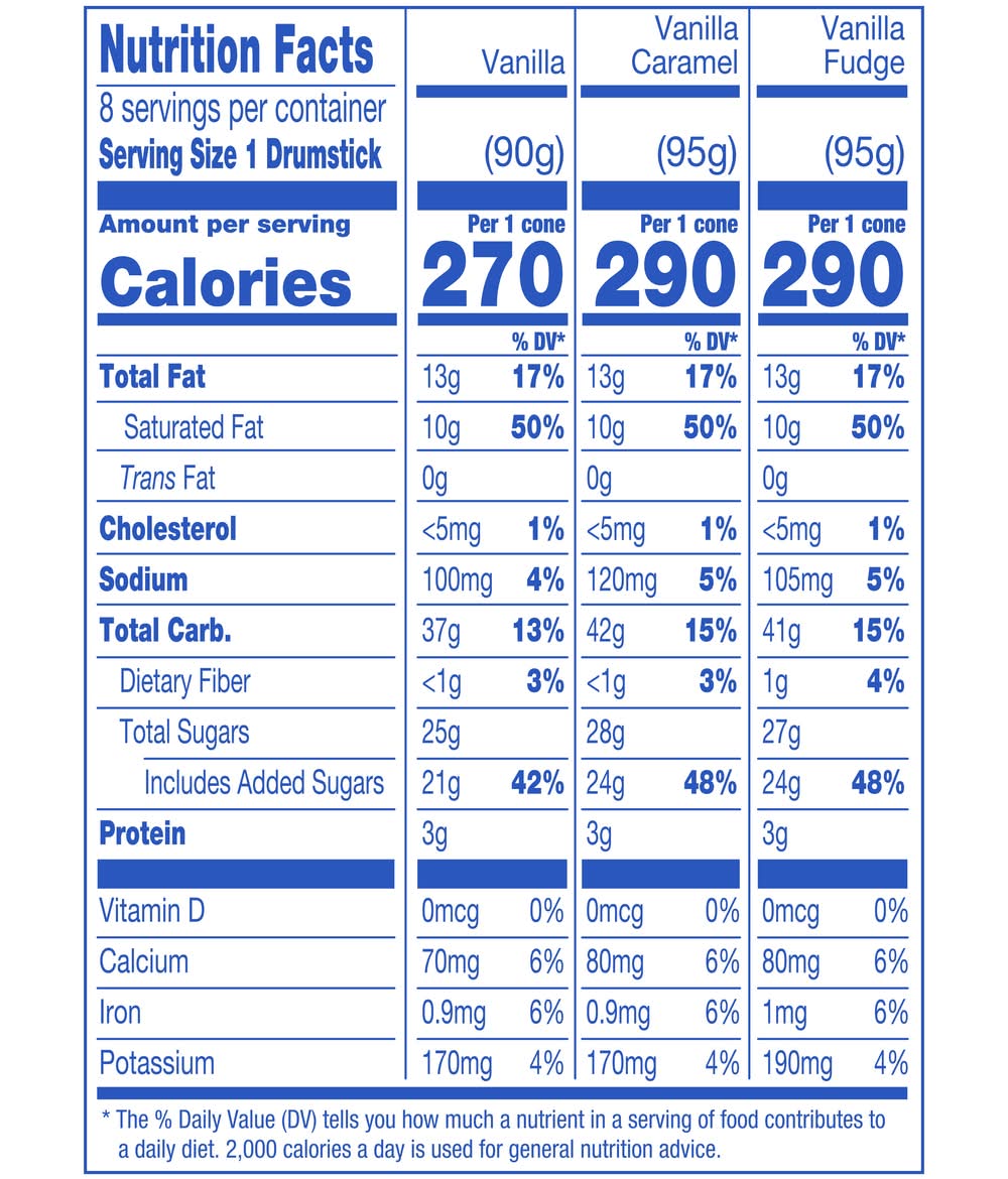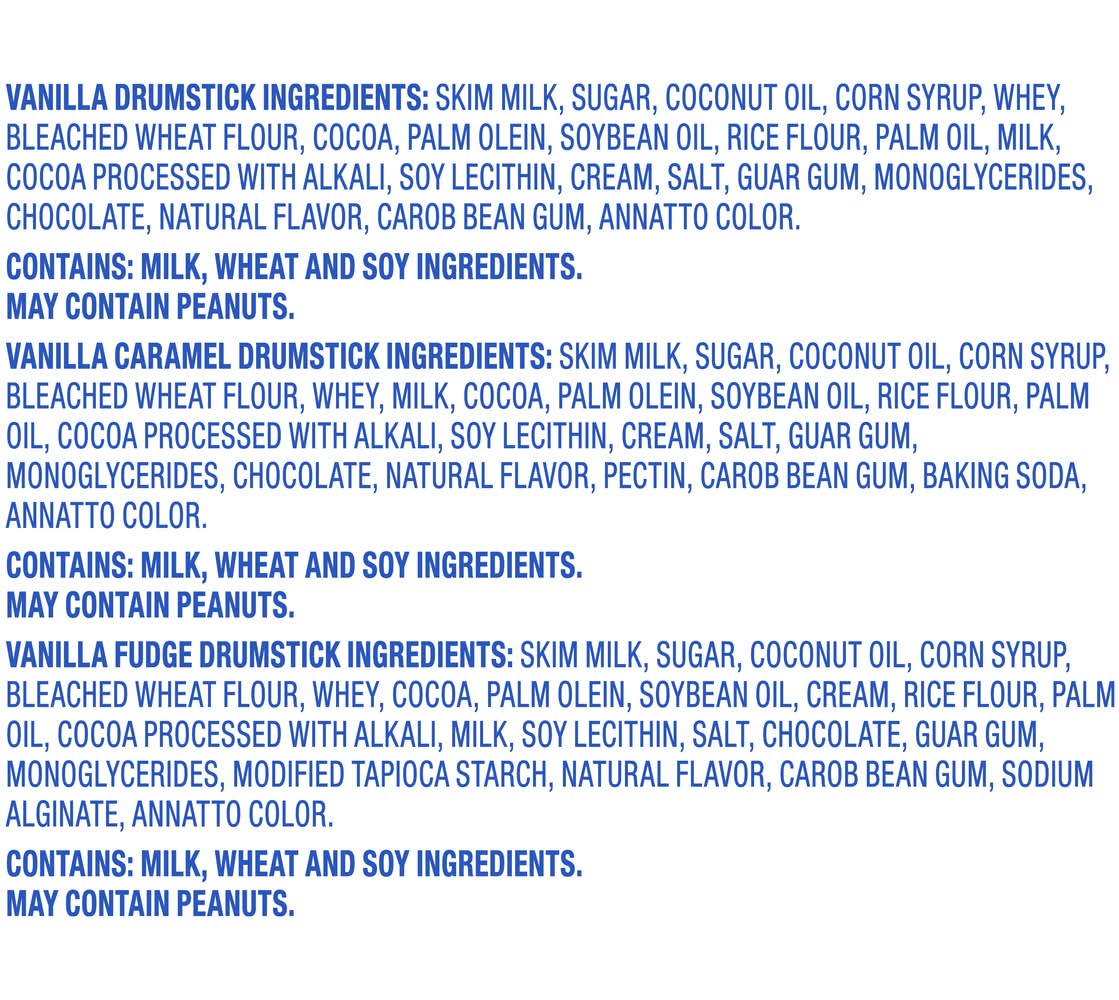 Ingredients: INGREDIENTS: VANILLA DRUMSTICK: DAIRY PRODUCT SOLIDS, SUGAR, SKIM MILK, COCONUT OIL, BLEACHED WHEAT FLOUR, CORN SYRUP, CREAM, MALTODEXTRIN, COCOA, PALM OLEIN, SOYBEAN OIL, RICE FLOUR, WHEY, PALM OIL, PROPYLENE GLYCOL MONOSTEARATE, COCOA PROCESSED WITH ALKALI, WHOLE MILK POWDER, SOY LECITHIN, GUAR GUM, CELLULOSE GEL, MONOGLYCERIDES, SALT, NATURAL FLAVOR, CAROB BEAN GUM, CHOCOLATE, CELLULOSE GUM, CALCIUM CARBONATE, ANNATTO COLOR. VANILLA CARAMEL DRUMSTICK: DAIRY PRODUCT SOLIDS, SUGAR, SKIM MILK, COCONUT OIL, CORN SYRUP, BLEACHED WHEAT FLOUR, CREAM, SWEETENED CONDENSED MILK (CONDENSED MILK; SUGAR), MALTODEXTRIN, COCOA, WATER, PALM OLEIN, SOYBEAN OIL, RICE FLOUR, WHEY, PALM OIL, PROPYLENE GLYCOL MONOSTEARATE, COCOA PROCESSED WITH ALKALI, WHOLE MILK POWDER, SOY LECITHIN, SALT, GUAR GUM, CELLULOSE GEL, MONOGLYCERIDES, NATURAL FLAVOR, CAROB BEAN GUM, CHOCOLATE, CELLULOSE GUM, PECTIN, CALCIUM CARBONATE, BAKING SODA, VANILLA EXTRACT, ANNATTO COLOR. VANILLA FUDGE DRUMSTICK: DAIRY PRODUCT SOLIDS, SUGAR, SKIM MILK, BLEACHED WHEAT FLOUR, CORN SYRUP, COCONUT OIL, CREAM, MALTODEXTRIN, COCOA, WATER, PALM OLEIN, SOYBEAN OIL, RICE FLOUR, WHEY, PALM OIL, COCOA PROCESSED WITH ALKALI, PROPYLENE GLYCOL MONOSTEARATE, WHOLE MILK POWDER, SOY LECITHIN, CHOCOLATE, GUAR GUM, CELLULOSE GEL, MONOGLYCERIDES, SALT, NATURAL FLAVOR, MODIFIED TAPIOCA STARCH, CAROB BEAN GUM, CELLULOSE, CALCIUM CARBONATE, SODIUM ALGINATE, ANNATTO COLOR Contains: Milk, Wheat, Soybeans, Corn, Peanuts