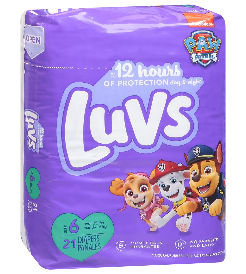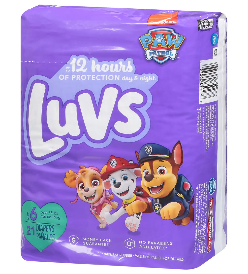 Up to 12 hours of protection day & night. No parabens and latex (Natural rubber). As always, made with a light Luvs scent. If you notice gel-like material on your baby's skin, don't be alarmed. This comes from the diaper padding and can be easily removed by wiping your baby's skin with a soft, dry cloth. Money back guarantee (Money Back Guarantee: If you're not completely satisfied, please send the original receipt and UPC to us within 45 days of purchase for a full product refund via prepaid card. Limited to one redemption per household or name • Size: 6 • Procter & gamble, Cincinnati, OH, 45202