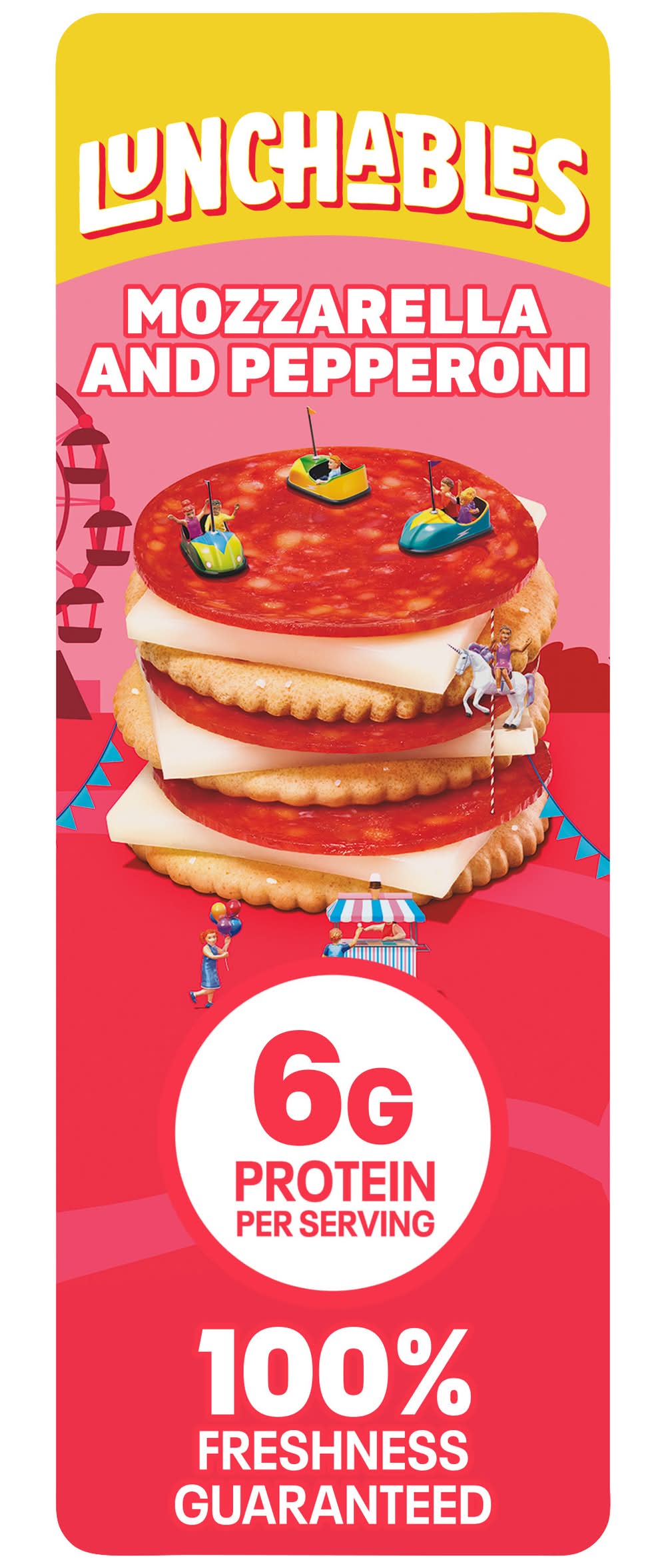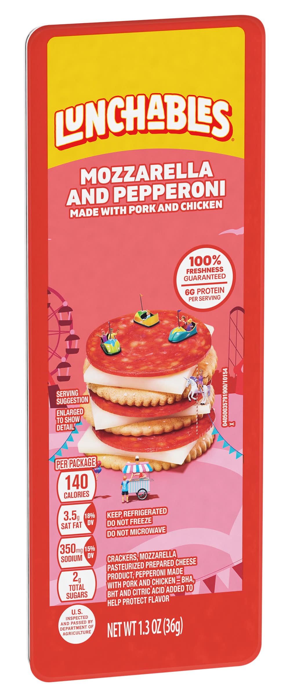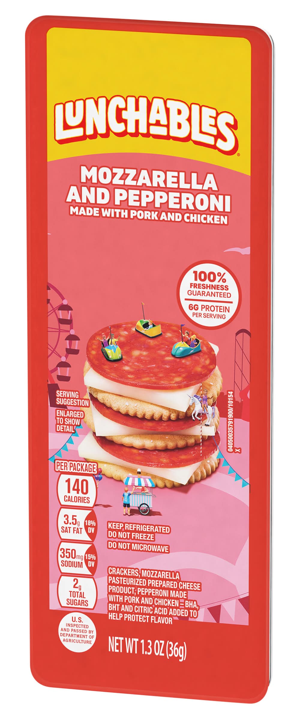 Built to be eaten, our Lunchables Pepperoni and Mozzarella Cheese tray is the perfect option for a convenient snack kids will enjoy any time of day! Our snack kit features real, epic food including pepperoni made with pork and chicken, Kraft mozzarella pasteurized prepared cheese product and crackers. Great for on the go, each ingredient comes in its own individual compartment in our serving tray, making it easy and fun to build your own unique combinations. Every 1.3 ounce tray contains 6 grams of protein per serving. Always remember to keep your Lunchables crackers refrigerated until you are ready to experience a delicious snack. Size: 1.3 OZ