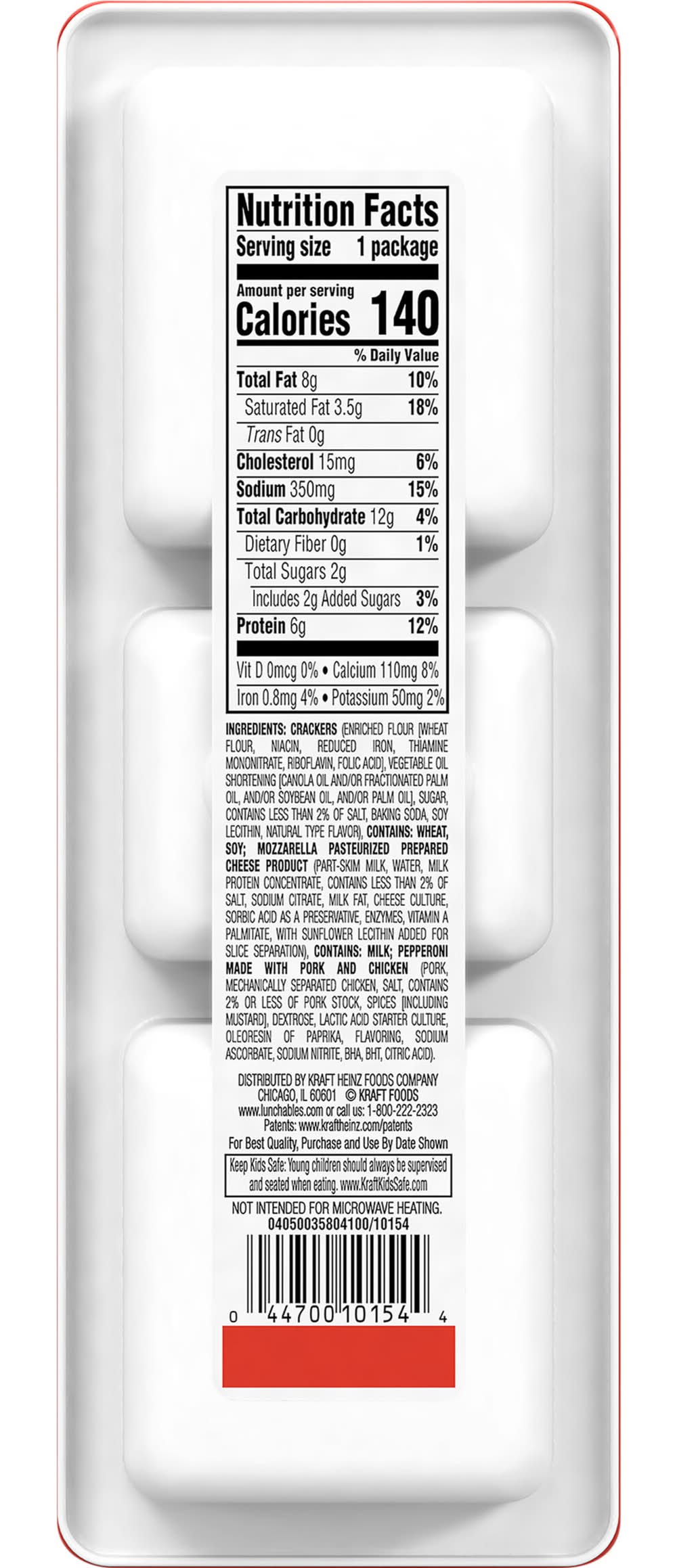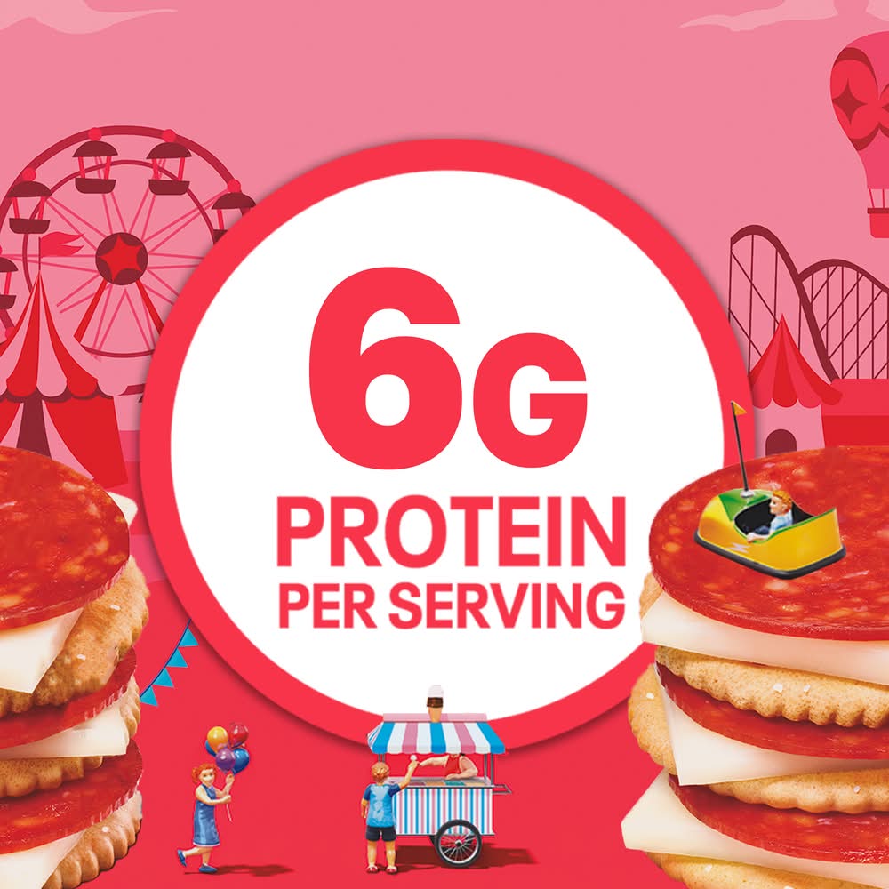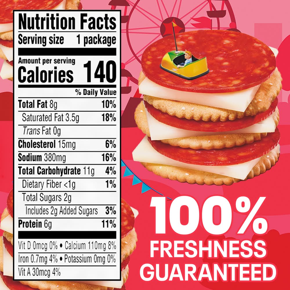 Ingredients: CRACKERS (ENRICHED FLOUR [WHEAT FLOUR, NIACIN, REDUCED IRON, THIAMINE MONONITRATE, RIBOFLAVIN, FOLIC ACID], PALM OIL, SUGAR, SALT, BAKING SODA, WHEY [FROM MILK], SOY LECITHIN, NATURAL FLAVOR), CONTAINS: WHEAT, SOY, MILK, MOZZARELLA PASTEURIZED PREPARED CHEESE PRODUCT (PART-SKIM MILK, WATER, MILK PROTEIN CONCENTRATE, CONTAINS LESS THAN 2% OF SALT, SODIUM CITRATE, MILK FAT, CHEESE CULTURE, SORBIC ACID AS A PRESERVATIVE, ENZYMES, VITAMIN A PALMITATE, WITH SUNFLOWER LECITHIN ADDED FOR SLICE SEPARATION), CONTAINS: MILK, PEPPERONI MADE WITH PORK AND CHICKEN (PORK, MECHANICALLY SEPARATED CHICKEN, SALT, CONTAINS 2% OR LESS OF PORK STOCK, SPICES [INCLUDING MUSTARD], DEXTROSE, LACTIC ACID STARTER CULTURE, OLEORESIN OF PAPRIKA, FLAVORING, SODIUM ASCORBATE, SODIUM NITRITE, BHA, BHT, CITRIC ACID), . Contains: Wheat, Milk, Soybeans, Mustard