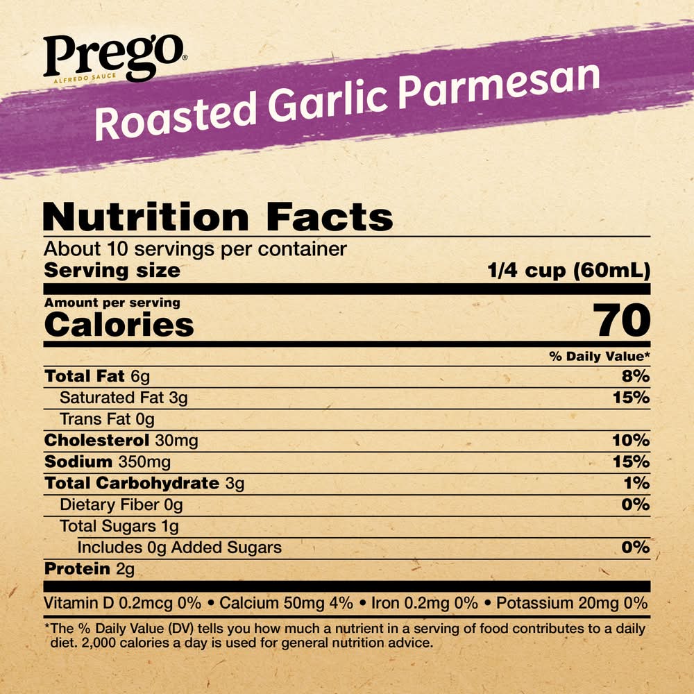 Bring everyone to the table with Prego Alfredo Sauce with Roasted Garlic and Parmesan Cheese, a pasta sauce crafted with tasty ingredients that's made to share with the ones you love. It's the sauce that brings delicious flavor to every meal, making ordinary meals extraordinary. Highlighting the delicious taste of roasted garlic and Parmesan cheese perfectly balanced with fresh cream, every jar offers a creamy texture for delightful flavor in every bite. Plus, it's made with no high fructose corn syrup, no added sugars, and no artificial colors, making it a choice you can feel good about every time you serve it. Prego is the secret to creating easy and delicious meals your whole family will love. Whether it's a quick weeknight pasta dish or a new recipe for family dinner, Prego is the Italian sauce brand you can always count on. With tasty ingredients and a taste that delights, Prego brings everyone together. Family dinners should be stress-free and easy, which is why Prego is crafted to be the foundation of your weeknight meals. With Prego, the taste kids and parents enjoy is right here, ready to enhance your meals and keep everyone at the table a little longer. • Size: 22 OZ • Campbell soup company, Camden,NJ,USA,888-FOR-PREGO • Packaging: Reusable
