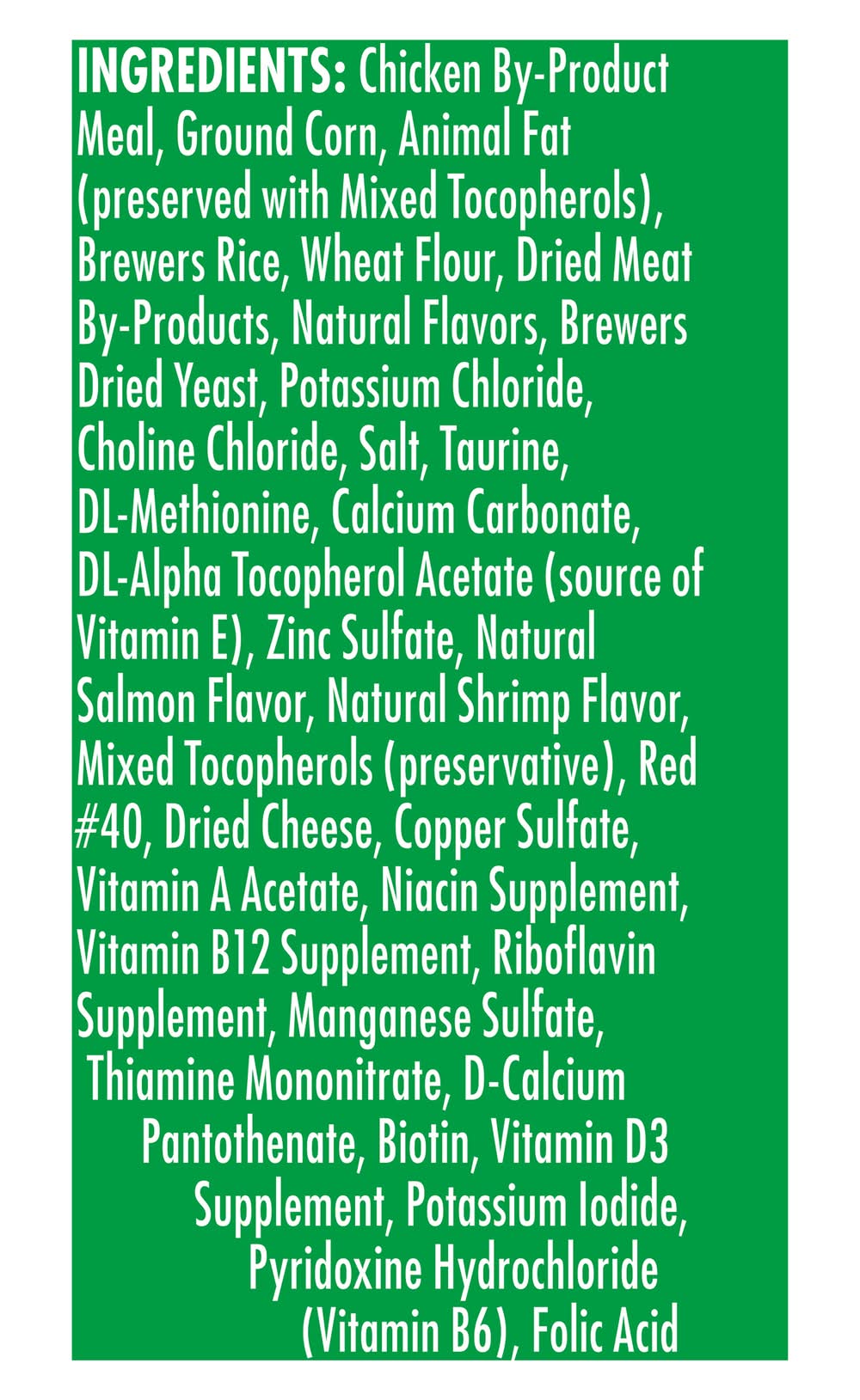 Ingredients: Chicken By-Product Meal, Ground Corn, Animal Fat (Preserved with Mixed Tocopherols), Brewers Rice, Wheat Flour, Dried Meat By-Products, Natural Flavors, Brewers Dried Yeast, Potassium Chloride, Choline Chloride, Salt, Taurine, DL-Methionine, Calcium Carbonate, DL-Alpha Tocopherol Acetate (Source of Vitamin E), Zinc Sulfate, Natural Salmon Flavor, Natural Shrimp Flavor, Mixed Tocopherols (Preservative), Red No. 40, Dried Cheese, Copper Sulfate, Vitamin A Acetate, Niacin Supplement, Vitamin B12 Supplement, Riboflavin Supplement, Manganese Sulfate, Thiamine Mononitrate, D-Calcium Pantothenate, Biotin, Vitamin D3 Supplement, Potassium Iodide, Pyridoxine Hydrochloride (Vitamin B6), Folic Acid Contains: Corn, Wheat, Fish, Salmon, Crustacean Shellfish, Shrimp