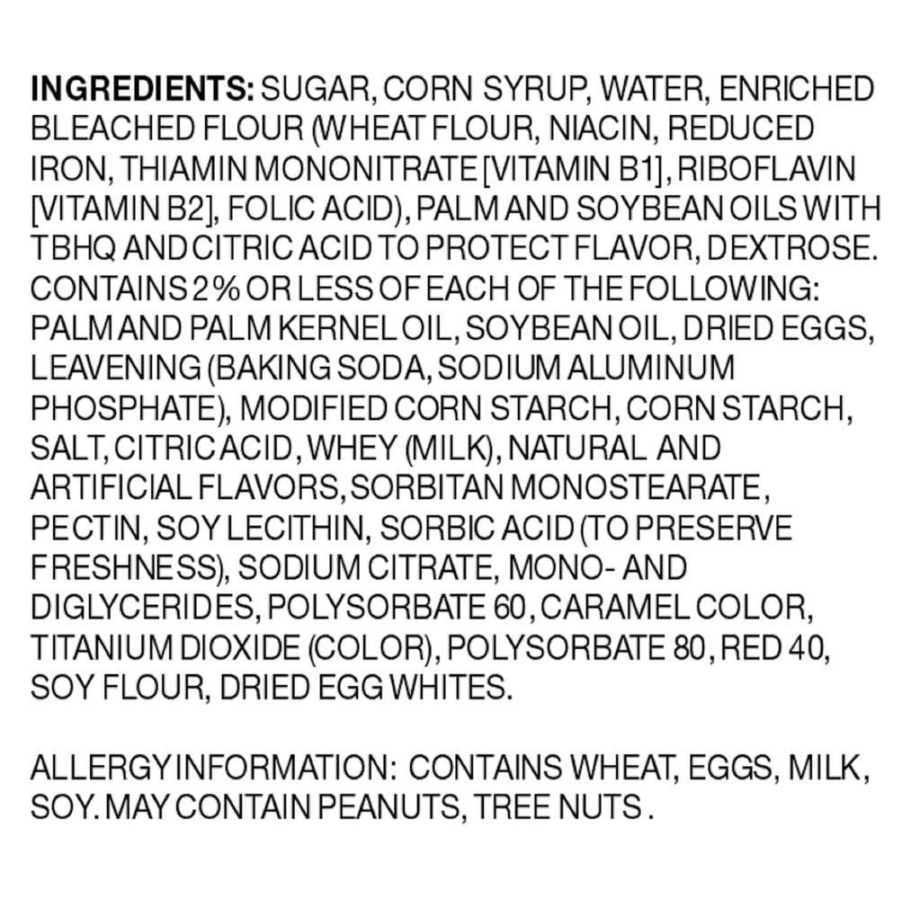Ingredients: Sugar, Corn Syrup, Water, Enriched Bleached Flour (Wheat Flour, Niacin, Reduced Iron, Thiamin Mononitrate [Vitamin B1], Riboflavin [Vitamin B2], Folic Acid), Palm and Soybean Oils with TBHQ and Citric Acid to Protect Flavor, Dextrose, Contains 2% or Less of Each of the Following: Palm and Palm Kernel Oil, Soybean Oil, Dried Eggs, Leavening (Baking Soda, Sodium Aluminum Phosphate), Modified Corn Starch, Corn Starch, Salt, Citric Acid, Whey (Milk), Natural and Artificial Flavors, Sorbitan Monostearate, Pectin, Soy Lecithin, Sorbic Acid (to Preserve Freshness), Sodium Citrate, Mono-and Diglycerides, Polysorbate 60, Caramel Color, Titanium Dioxide (Color), Polysorbate 80, Red 40, Soy Flour, Dried Egg Whites Contains: Wheat, Soy, Egg, Peanuts, Tree Nuts