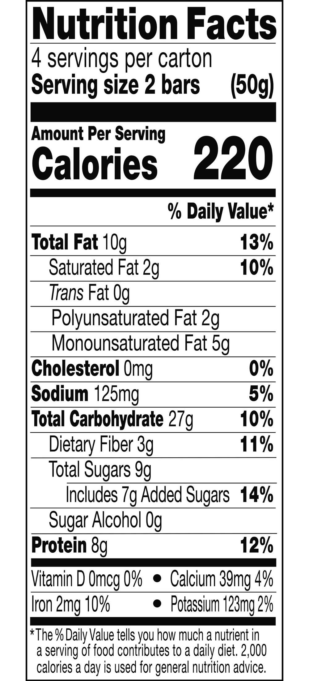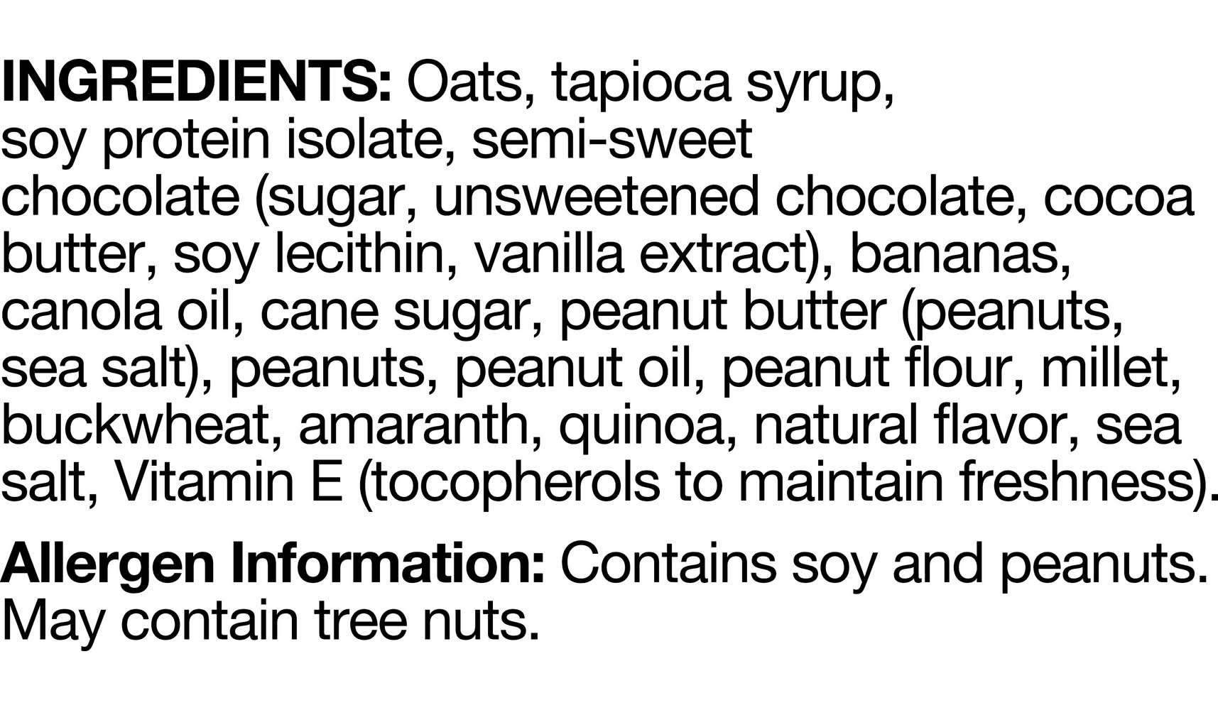 Ingredients: INGREDIENTS: Oats, tapioca syrup, soy protein isolate, semi-sweet chocolate (sugar, unsweetened chocolate, cocoa butter, soy lecithin, vanilla extract), bananas, canola oil, cane sugar, peanut butter (peanuts, sea salt), peanuts, peanut oil, peanut flour, millet, buckwheat, amaranth, quinoa, natural flavor, sea salt, Vitamin E (tocopherols to maintain freshness). Contains: Allergen Information: Contains soy and peanuts. May contain tree nuts.