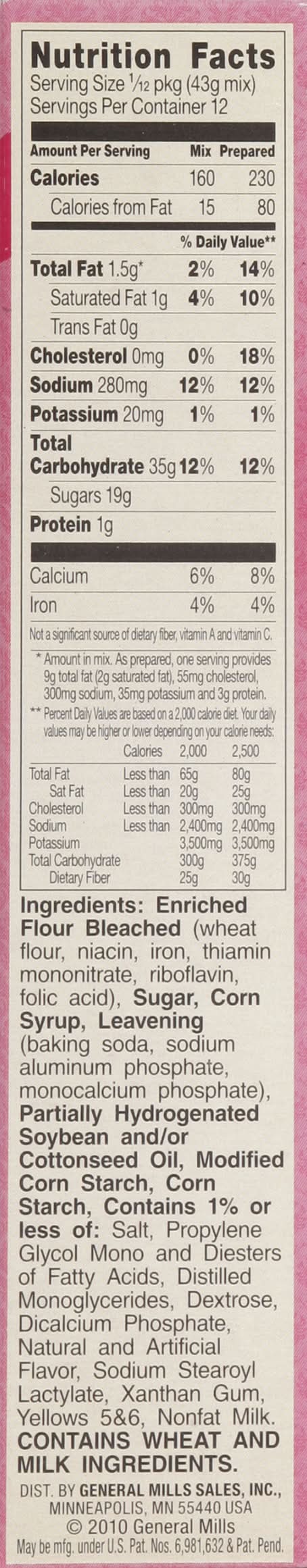 Ingredients: Enriched Flour Bleached (Wheat Flour, Niacin, Iron, Thiamin Mononitrate, Riboflavin, Folic Acid), Sugar, Corn Syrup, Leavening (Baking Soda, Sodium Aluminum Phosphate, Monocalcium Phosphate), Partially Hydrogenated Soybean and/or Cottonseed Oil, Modified Corn Starch, Corn Starch, Contains 1% or Less of: Salt, Propylene Glycol Mono and Diesters of Fatty Acids, Distilled Monoglycerides, Dextrose, Dicalcium Phosphate, Natural and Artificial Flavor, Sodium Stearoyl Lactylate, Xanthan Gum, Yellows 5 & 6, Nonfat Milk Contains: Milk, Wheat
