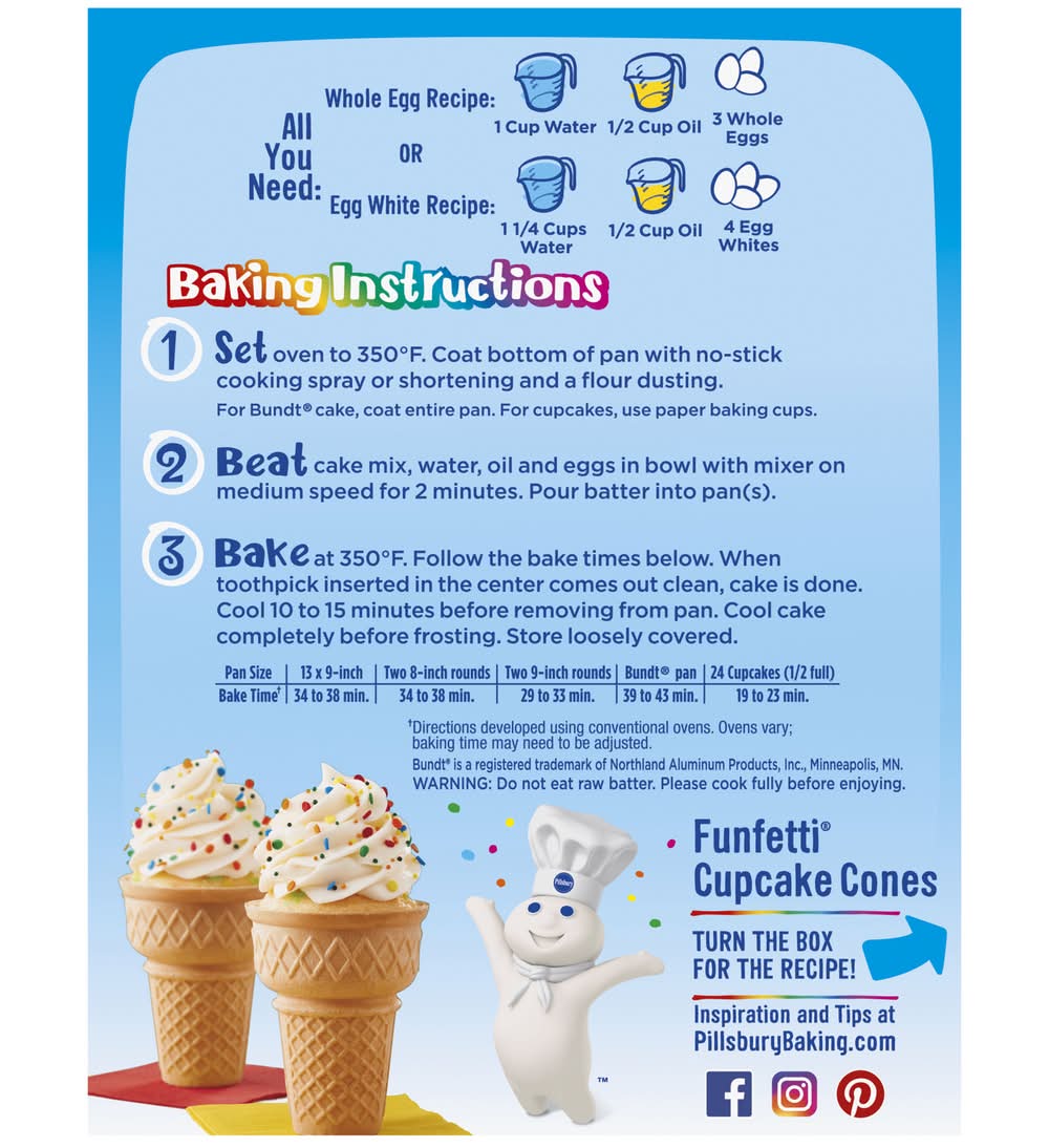 All you need: whole egg recipe: 1 cup water; 1/2 cup oil; 3 whole eggs (if desired, substitute 1/2 cup egg substitute for the eggs) or egg white recipe: 1-1/4 cups water; 1/2 cup oil; 4 egg whites. substitutions: eggs: use 1/4 cup of greek yogurt or oil: use 1/2 cup unsweetened applesauce. baking instructions: 1. set oven to 350 degrees f. coat bottom of pan with no-stick cooking spray or shortening and a flour dusting. for bundt cake, coat entire pan. for cupcakes, use paper baking cups. 2. beat cake mix, water, oil and eggs in bowl with mixer on medium speed for 2 minutes. pour batter into pan(s). 3. bake at 350 degrees f. follow the bake times below. when toothpick inserted in the center comes out clean, cake is done. cool 10 to 15 minutes before removing from pan. cool cake completely before frosting. store loosely covered. pan size: 13 x 9-inch; bake time: 34 to 38 min. pan size: two 8-inch rounds; bake time: 34 to 38 min. pan size: two 9-inch rounds; bake time: 29 to 33 min. pan size: bundt pan; bake time: 39 to 43 min. pan size: 24 cupcakes (1/2 full); bake time: 19 to 23 min. directions developed using conventional ovens. ovens vary; baking time may need to be adjusted. warning: do not eat raw batter. please cook fully before enjoying.