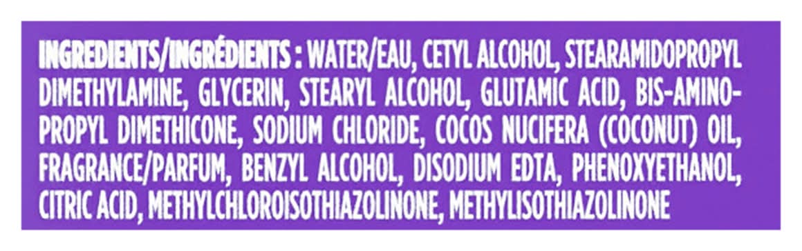 Ingredients: Water/Eau, Cetyl Alcohol, Stearamidopropyl Dimethylamine, Glycerin, Stearyl Alcohol, Glutamic Acid, Bis-Amino-Propyl Dimethicone, Sodium Chloride, Cocos Nucifera (Coconut) Oil, Fragrance/Parfum, Benzyl Alcohol, Disodium EDTA, Phenoxyethanol, Citric Acid, Methylchloroisothiazolinone, Methylisothiazolinone