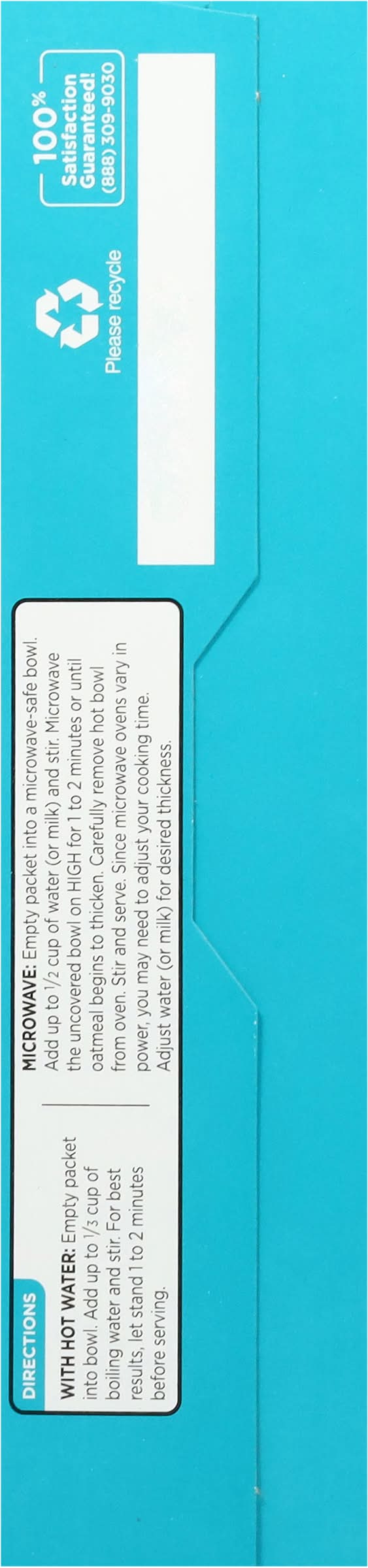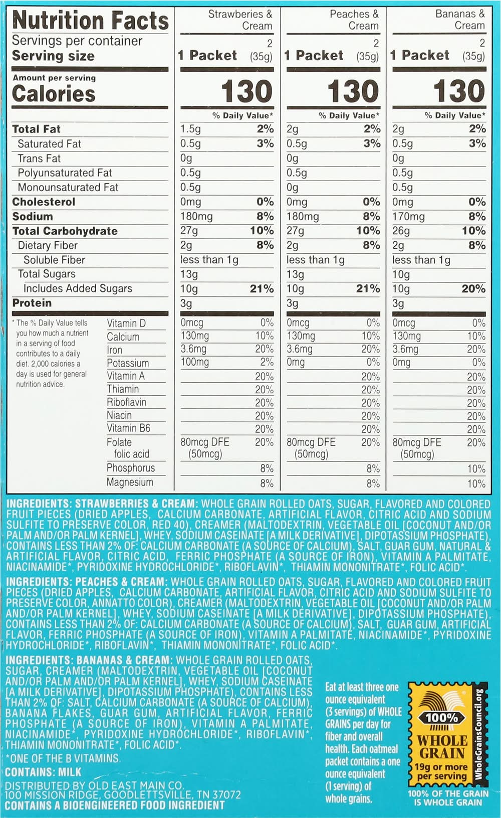 Ingredients: Strawberries & Cream: Whole Grain Rolled Oats, Sugar, Flavored and Colored Fruit Pieces (Dried Apples, Calcium Carbonate, Artificial Flavor, Citric Acid and Sodium Sulfite to Preserve Color, Red 40), Creamer (Maltodextrin, Vegetable Oil [Coconut and/or Palm and/or Palm Kernel], Whey, Sodium Caseinate [a Milk Derivative], Dipotassium Phosphate), Contains Less than 2% of: Calcium Carbonate (a Source of Calcium), Salt, Guar Gum, Natural & Artificial Flavor, Citric Acid, Ferric Phosphate (a Source of Iron), Vitamin A Palmitate, Niacinamide*, Pyridoxine Hydrochloride*, Riboflavin*, Thiamin Mononitrate*, Folic Acid*. * One of the B Vitamins. Peaches & Cream: Whole Grain Rolled Oats, Sugar, Flavored and Colored Fruit Pieces (Dried Apples, Calcium Carbonate, Artificial Flavor, Citric Acid and Sodium Sulfite to Preserve Color, Annatto Color), Creamer (Maltodextrin, Vegetable Oil [Coconut and/or Palm and/or Palm Kernel], Whey, Sodium Caseinate [a Milk Derivative], Dipotassium Phosphate), Contains Less than 2% of: Calcium Carbonate (a Source of Calcium), Salt, Guar Gum, Artificial Flavor, Ferric Phosphate (a Source of Iron), Vitamin A Palmitate, Niacinamide*, Pyridoxine Hydrochloride*, Riboflavin*, Thiamin Mononitrate*, Folic Acid*. * One of the B Vitamins. Bananas & Cream: Whole Grain Rolled Oats, Sugar, Creamer (Maltodextrin, Vegetable Oil [Coconut and/or Palm and/or Palm Kernel], Whey, Sodium Caseinate [a Milk Derivative], Dipotassium Phosphate), Contains Less than 2% of: Salt, Calcium Carbonate (a Source of Calcium), Banana Flakes, Guar Gum, Artificial Flavor, Ferric Phosphate (a Source of Iron), Vitamin A Palmitate, Niacinamide, Pyridoxine Hydrochloride*, Riboflavin*, Thiamin Mononitrate*, Folic Acid*. * One of the B Vitamins. Contains: Oat, Sulfites, Milk