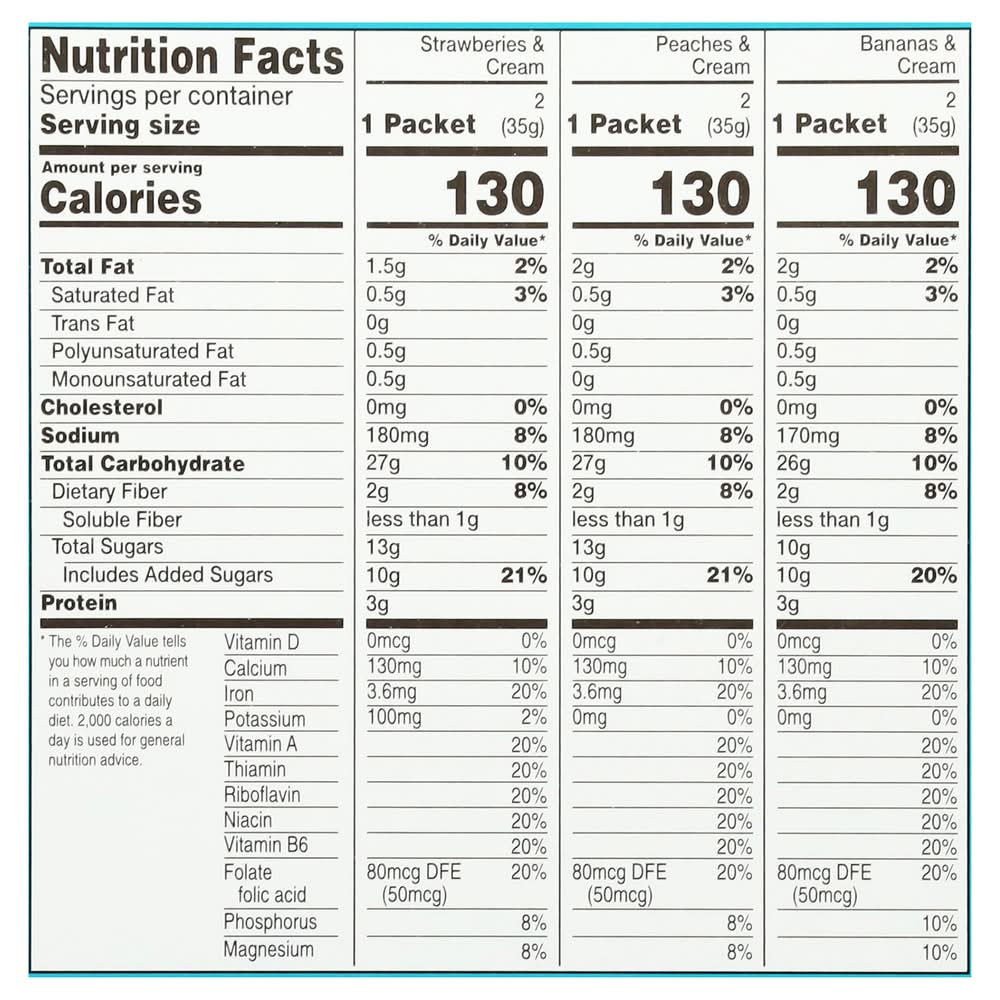Fruit & Cream Strawberries & Cream/Peaches & Cream/Bananas & Cream Instant Oatmeal Variety Pack • Flavor: Strawberries & cream-peaches & cream-bananas & cream • Pack size: 6 • Size: 6 CT • Number of servings: 2